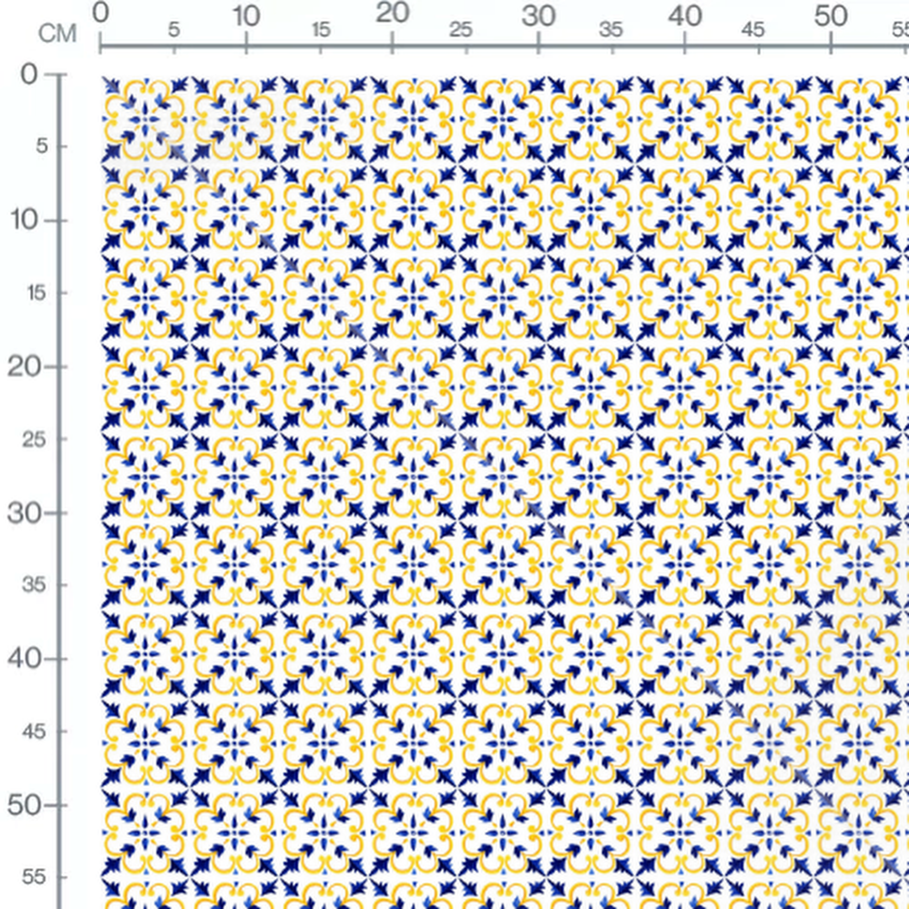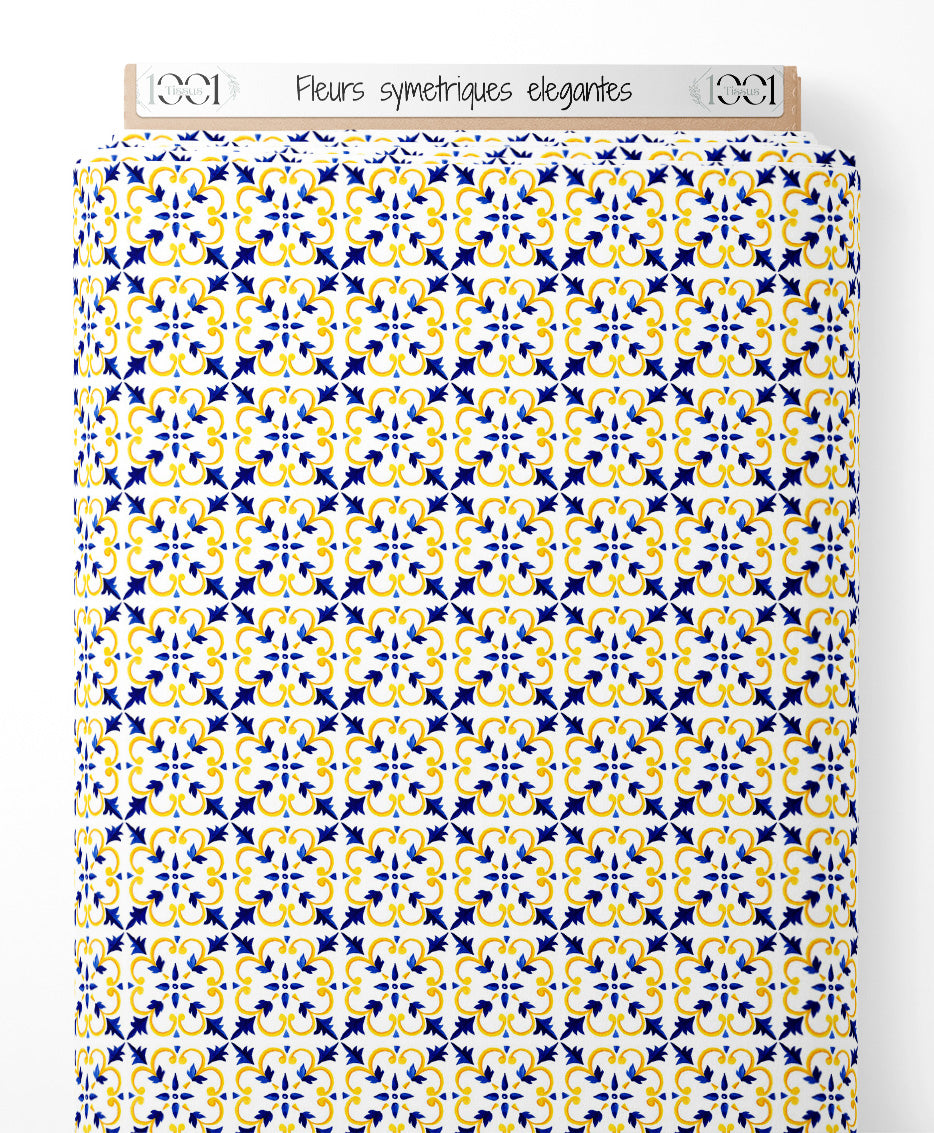 Les motifs floraux présentent des formes symétriques en bleu et jaune. Les détails géométriques ajoutent une touche élégante au design. Le fond blanc met en valeur les couleurs vives des motifs.Les tissus
