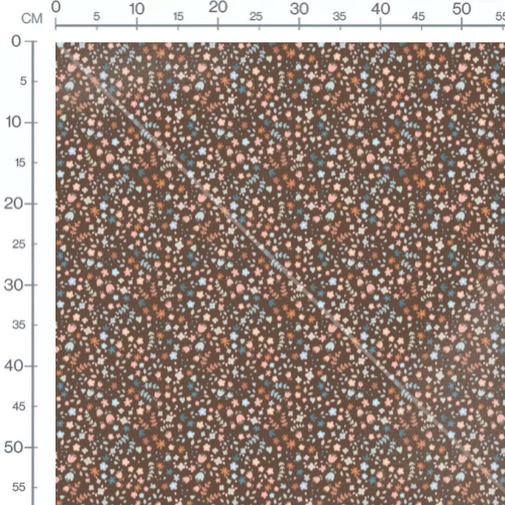 Petites fleurs roses, bleues et blanches dispersées. Feuilles vertes et cœurs bleus complètent le motif.Les tissus