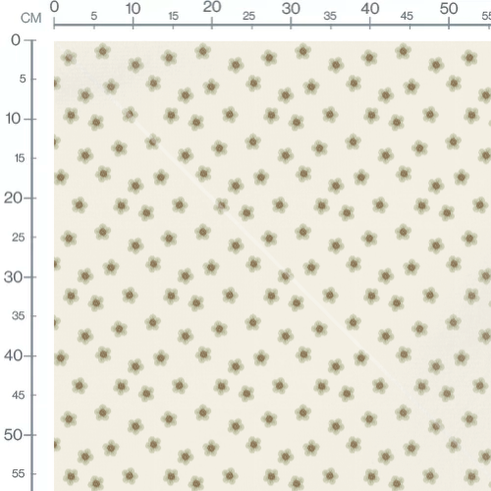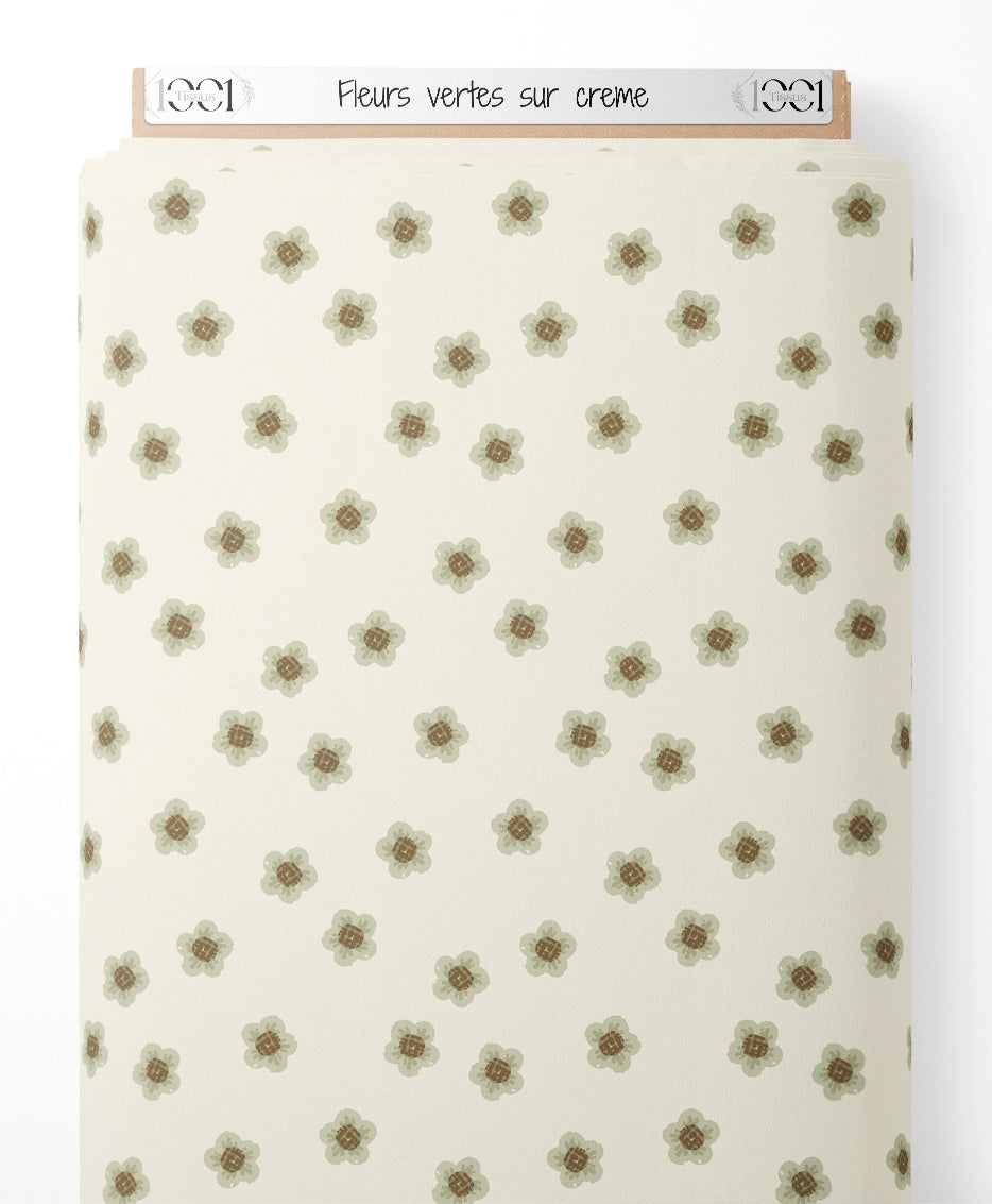 Petites fleurs vertes avec centre brun sur fond crème. Motif floral répétitif et délicat.Les tissus