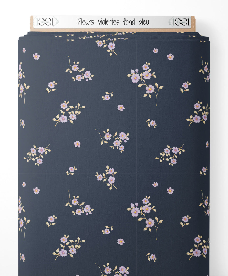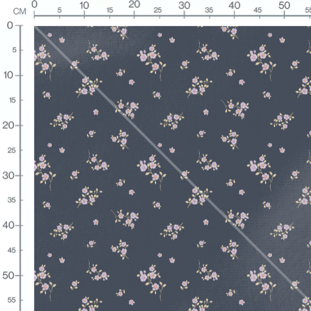 Les fleurs sont regroupées en petits bouquets. Les feuilles beige ajoutent une touche de contraste au fond sombre.Les tissus