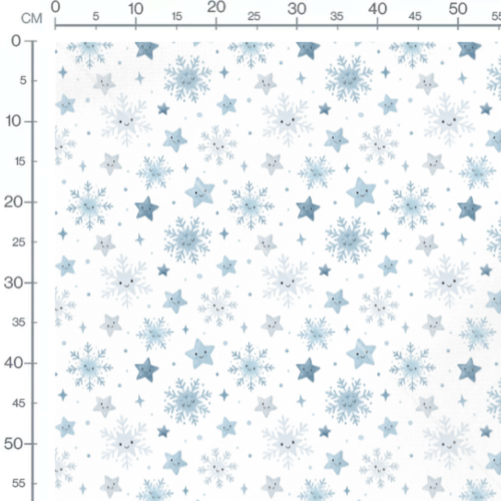 Les flocons de neige présentent des visages souriants et sont de différentes tailles. Les étoiles bleues ajoutent une touche ludique au motif hivernal.Les tissus