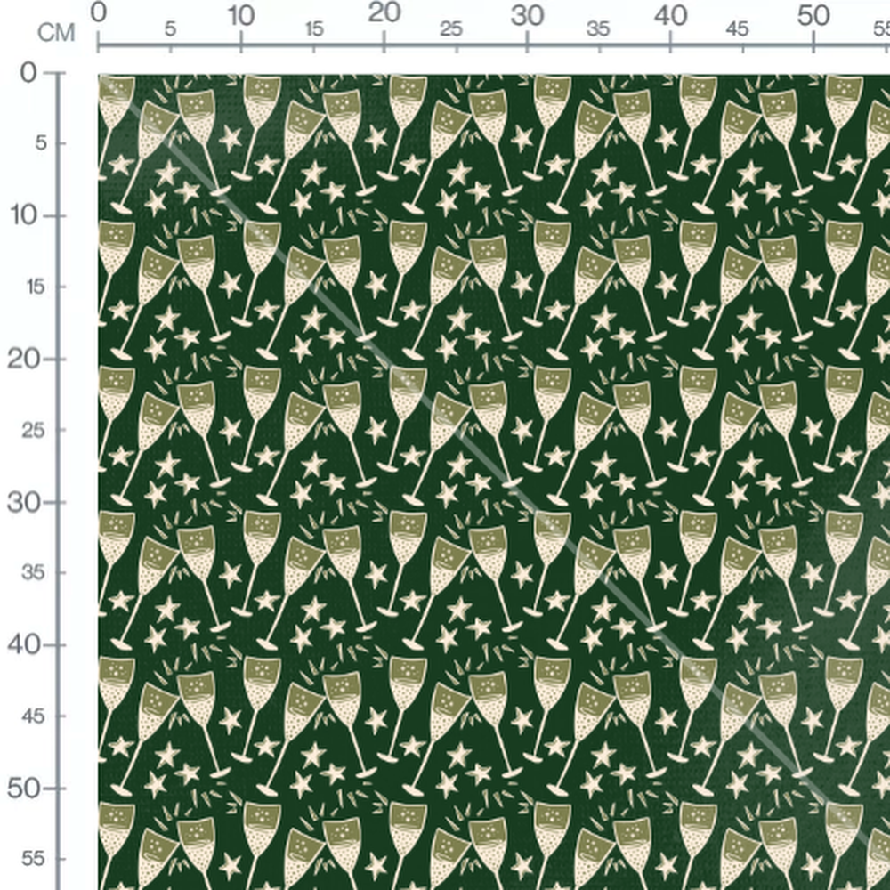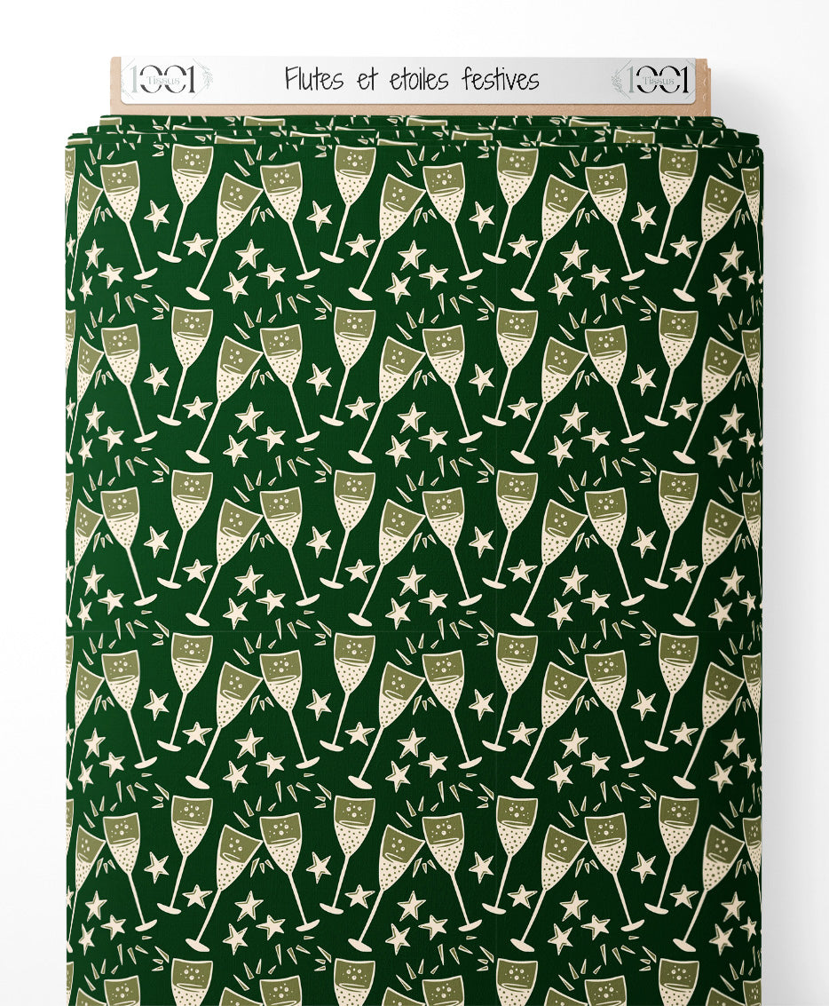 Les flûtes à champagne sont ornées de petites bulles. Les étoiles blanches ajoutent une touche festive au motif.Les tissus