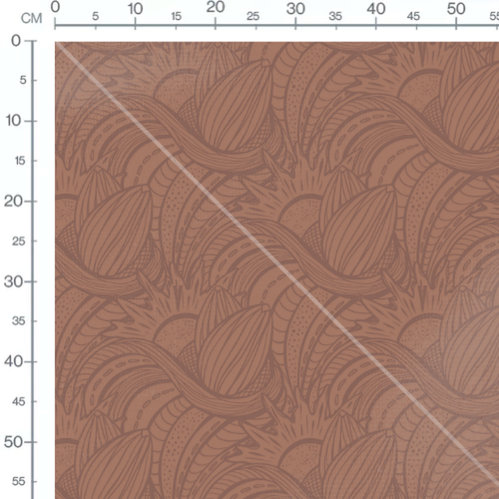 Les formes incluent des courbes et des motifs géométriques variés. Le design est monochrome avec différentes nuances de brun. Les motifs créent une impression de mouvement fluide.Les tissus