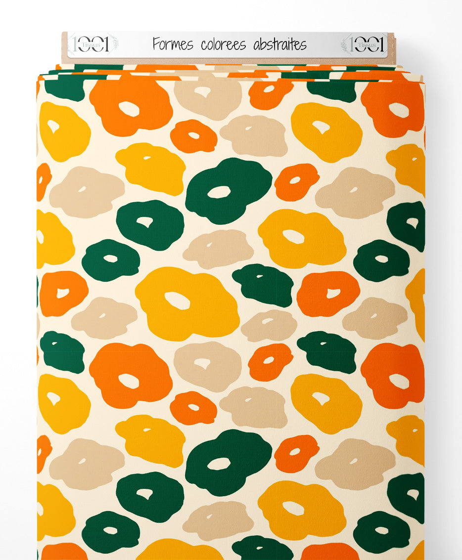 Les formes orange, jaune, vert foncé et beige se répètent de manière aléatoire. Chaque forme a une apparence unique, créant un motif dynamique et coloré.Les tissus