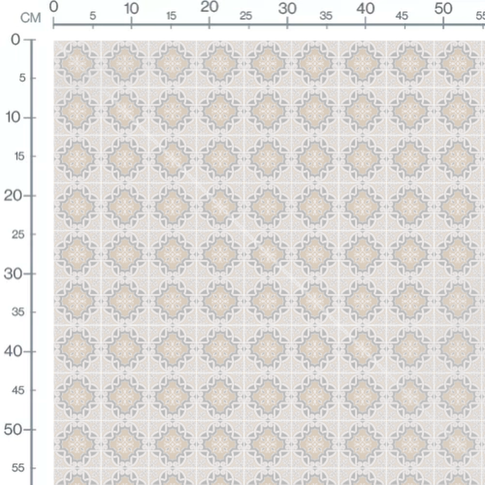Les motifs présentent des formes circulaires et angulaires entrelacées. Les couleurs beige et gris créent un contraste subtil sur le fond blanc. Les détails complexes ajoutent une touche d'élégance au design.Les tissus