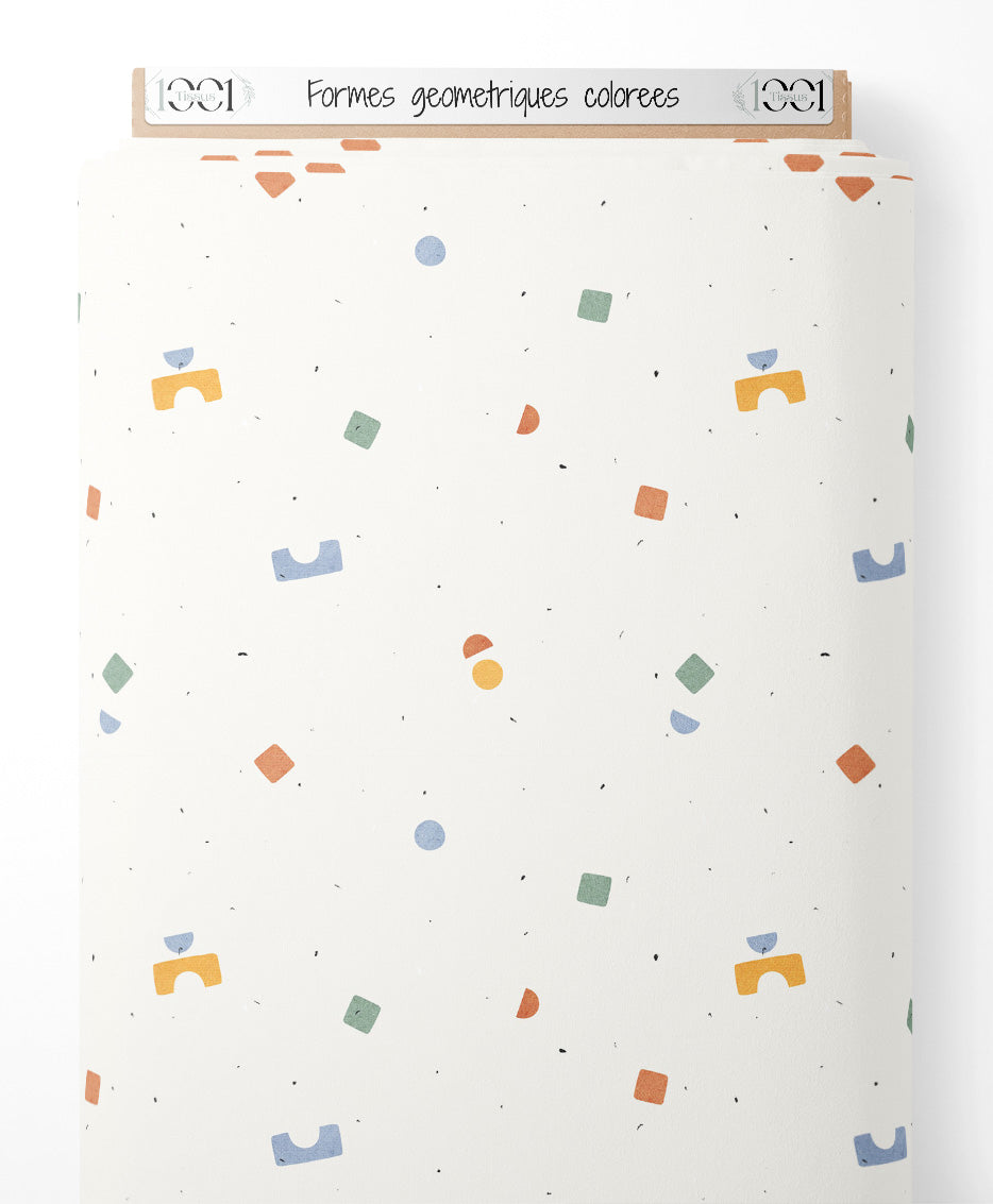 Les formes incluent des cercles, des demi-cercles, des carrés et des rectangles. Chaque forme est d'une couleur différente, ajoutant une touche de diversité au motif. Les petits points noirs ajoutent un contraste subtil au design.Les tissus