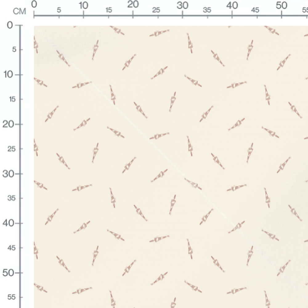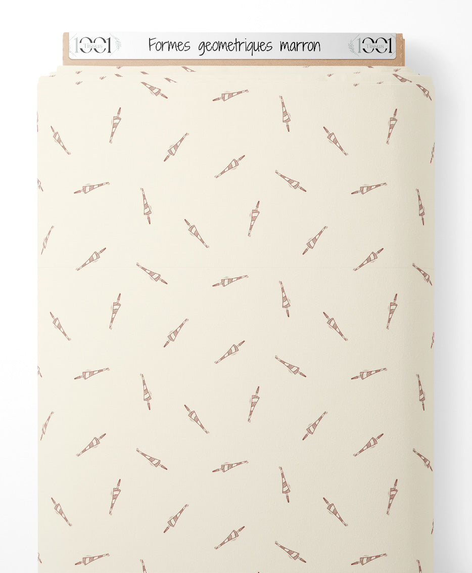 Les formes sont disposées de manière aléatoire sur le fond. Chaque figure présente des lignes et des angles distincts. Le fond beige met en valeur les motifs marron.Les tissus