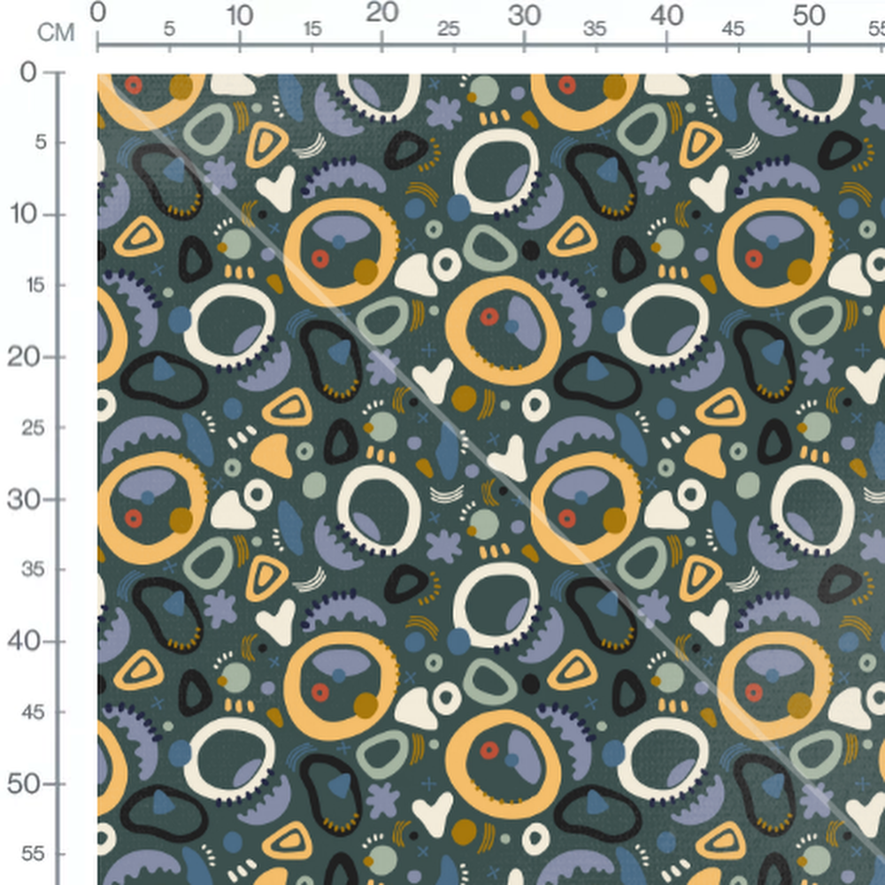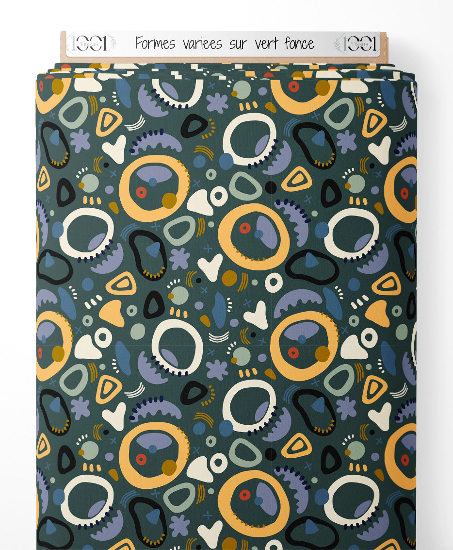 Les formes incluent des cercles et des arcs de différentes tailles. Des motifs irréguliers en bleu, orange, blanc et noir parsèment le fond. Des touches de violet et de gris ajoutent de la variété au design.Les tissus
