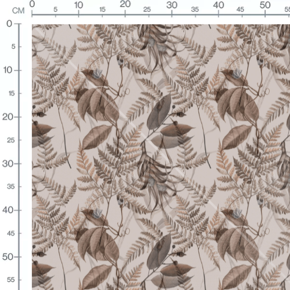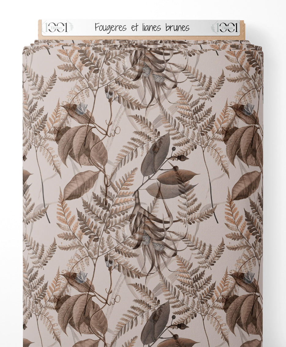 Les feuilles sont variées en forme et taille, avec des nuances allant du brun clair au brun foncé. Les fougères ajoutent une texture délicate au motif. Des lianes fines s'entrelacent parmi les feuilles. Le fond beige met en valeur les détails des feuillages.Les tissus
