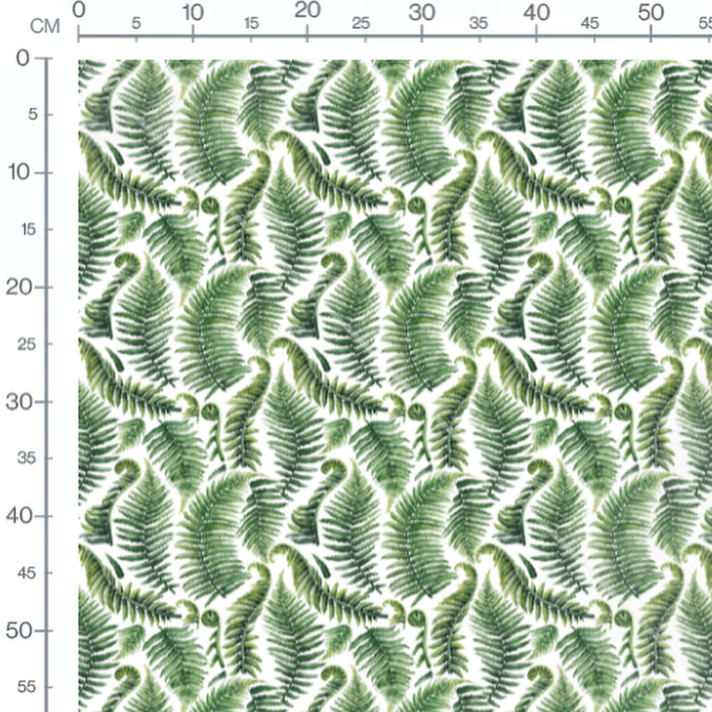 Les fougères présentent différentes nuances de vert, allant du clair au foncé. Le style aquarelle ajoute une touche artistique au motif. Les feuilles sont disposées de manière aléatoire, créant une impression de forêt tropicale. Les détails des frondes sont finement dessinés, accentuant le réalisme du motif.Les tissus