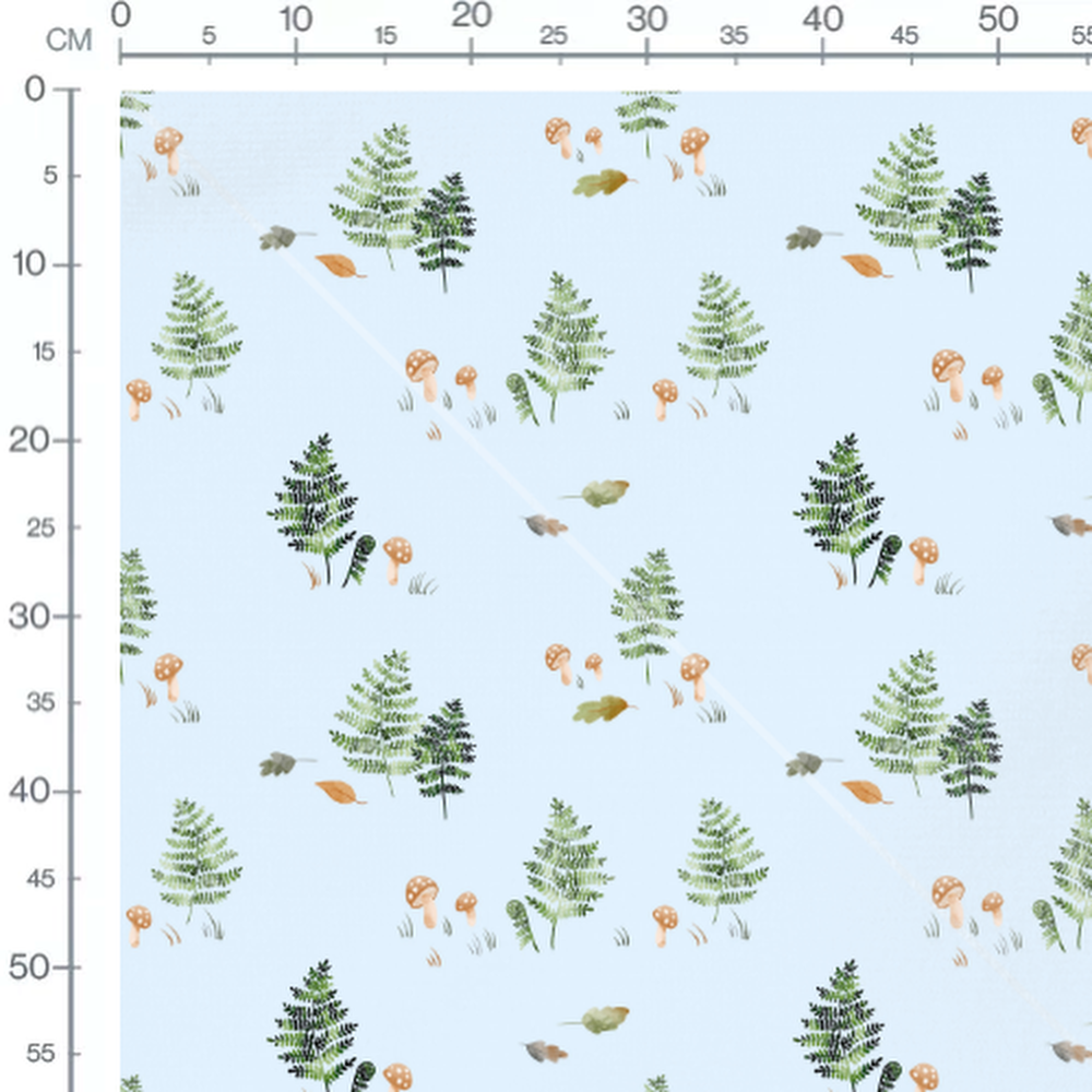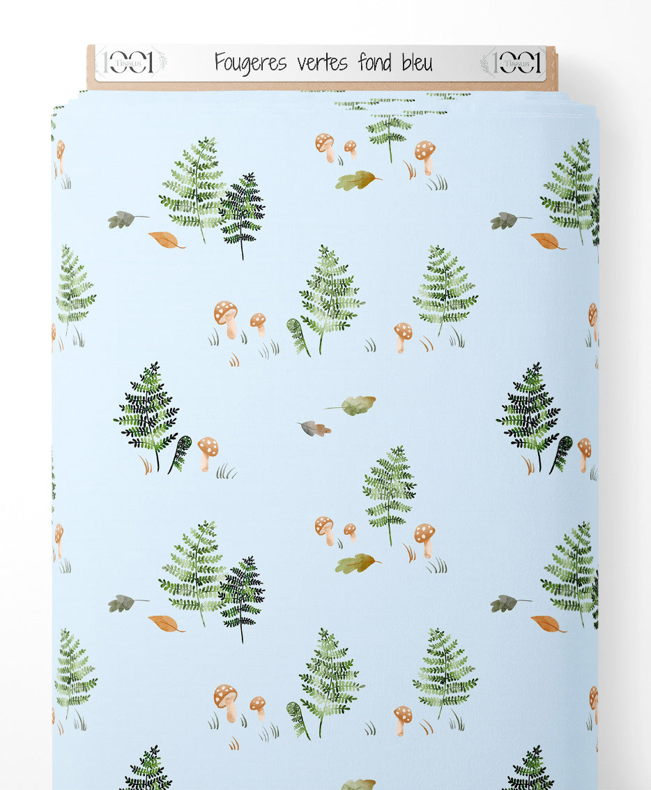 Les fougères varient du vert clair au vert foncé. Les champignons sont parsemés de petites taches blanches. Quelques feuilles tombées ajoutent une touche automnale.Les tissus