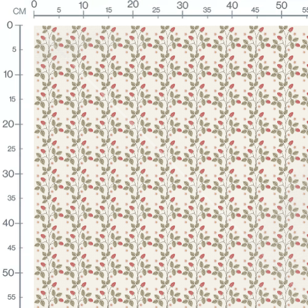 Les fraises rouges sont entourées de petites fleurs roses. Les feuilles vertes ajoutent un contraste naturel au motif.Les tissus