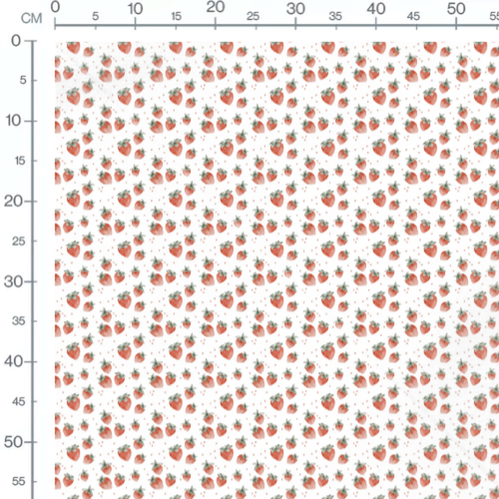 Les fraises sont dessinées avec des nuances de rouge et des feuilles vertes. Les petits points rouges ajoutent un élément décoratif subtil au motif.Les tissus