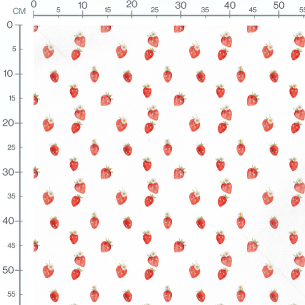 Les fraises sont dessinées avec des expressions joyeuses. Les fleurs blanches ajoutent une touche délicate au motif. Les feuilles vertes complètent l'ensemble avec une touche naturelle.Les tissus