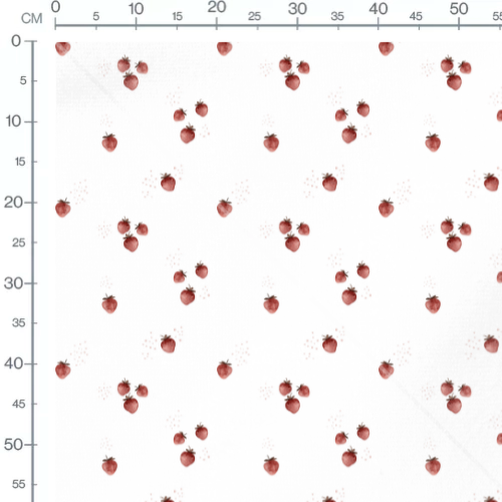 Les fraises sont de couleur rouge avec des détails bruns. Les petits points roses ajoutent une touche délicate au motif.Les tissus