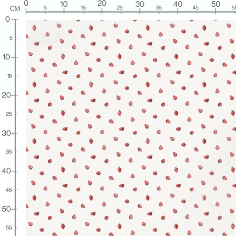 Les fraises sont dispersées uniformément sur le fond. Chaque fraise est accompagnée de petites feuilles vertes.Les tissus