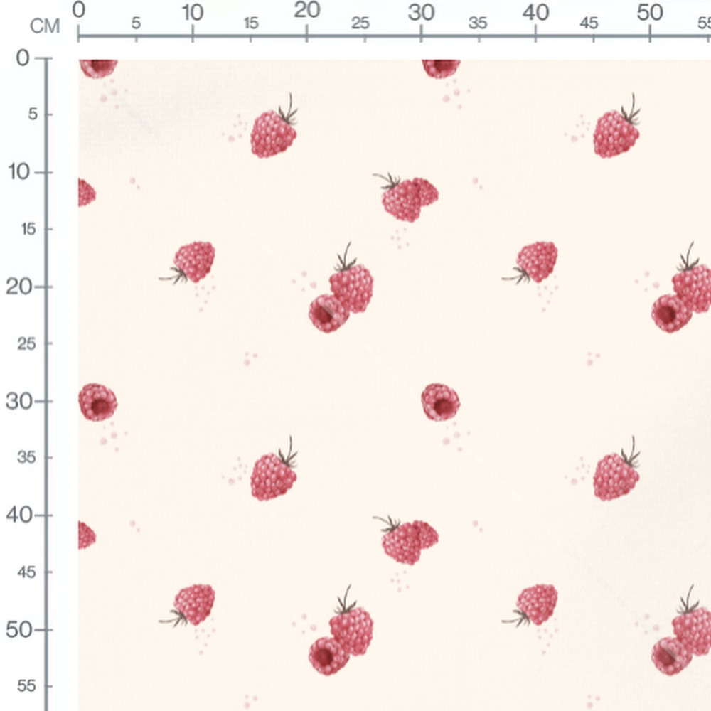 Les framboises sont dessinées avec des détails réalistes. Les petites taches roses ajoutent une touche de délicatesse au motif.Les tissus