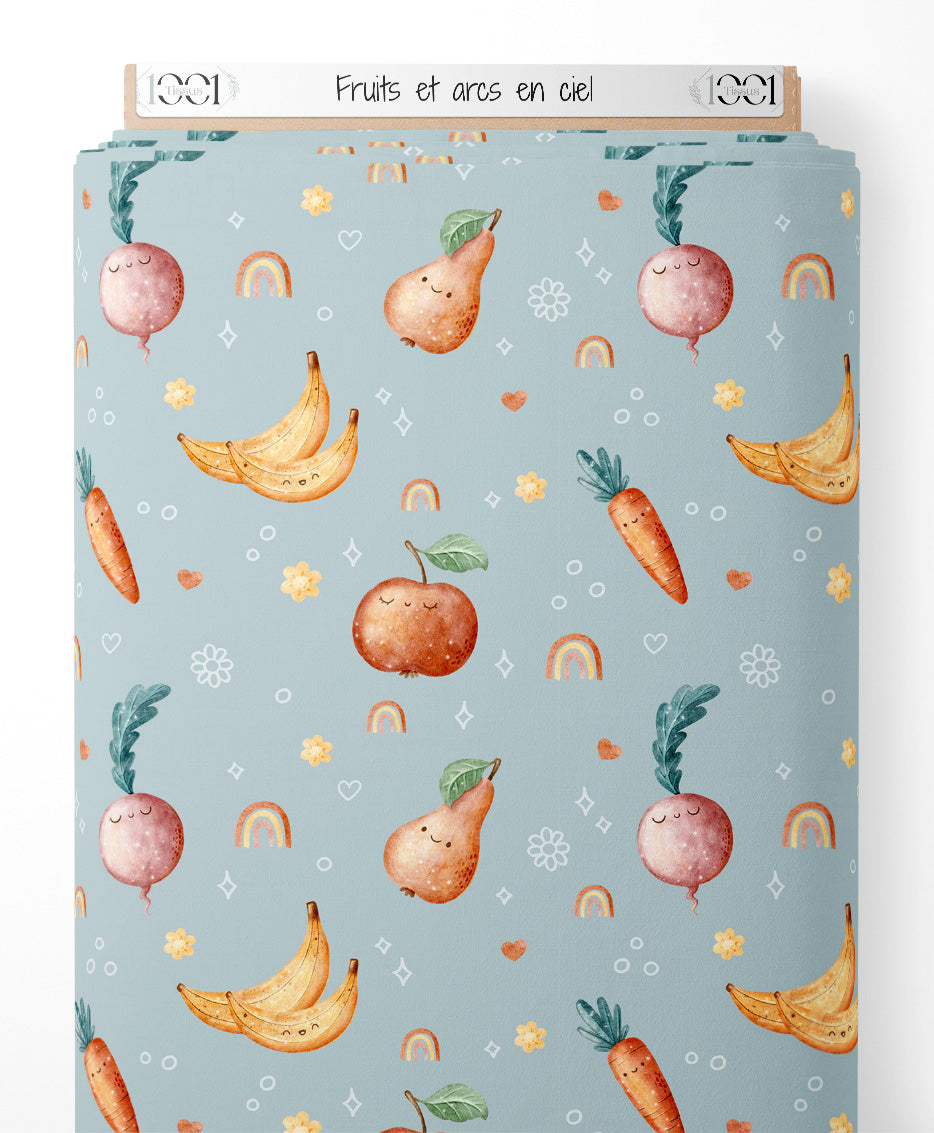Les fruits incluent des carottes, des bananes, des poires et des pommes, tous avec des visages souriants. Des arcs-en-ciel, des fleurs et des formes géométriques complètent le motif sur un fond bleu clair.Les tissus