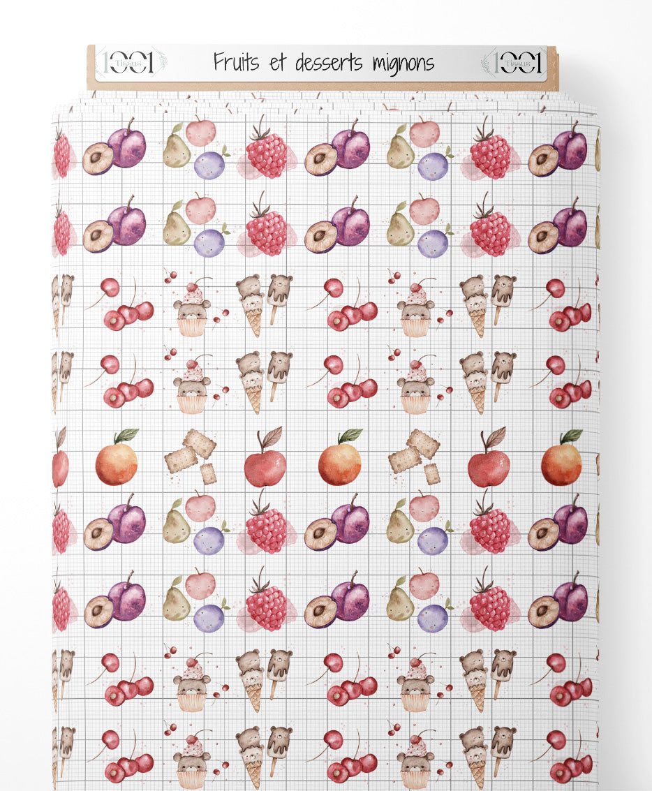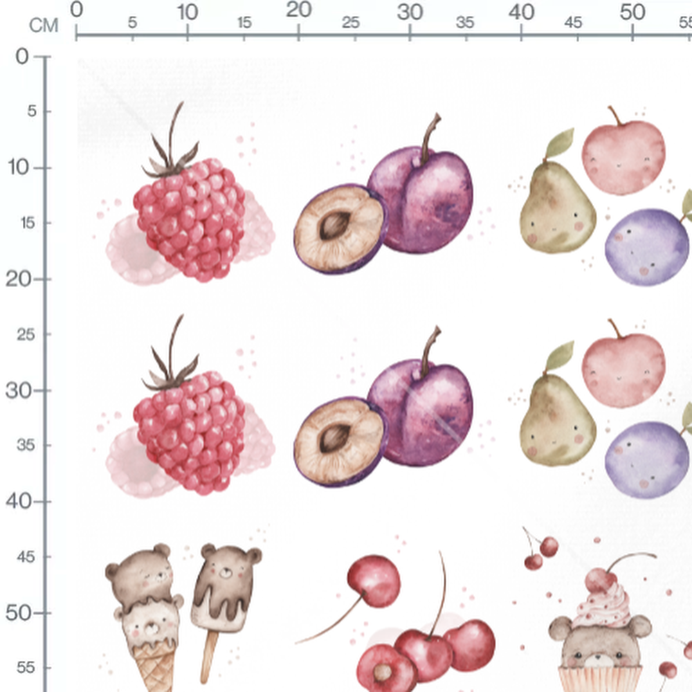 Les fruits incluent des framboises, des prunes, des poires, des pommes et des cerises. Les desserts sont des glaces et des cupcakes avec des motifs d'ours. Les couleurs sont principalement pastel avec des détails blancs.Les tissus