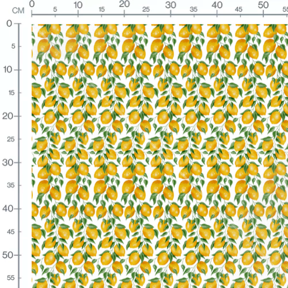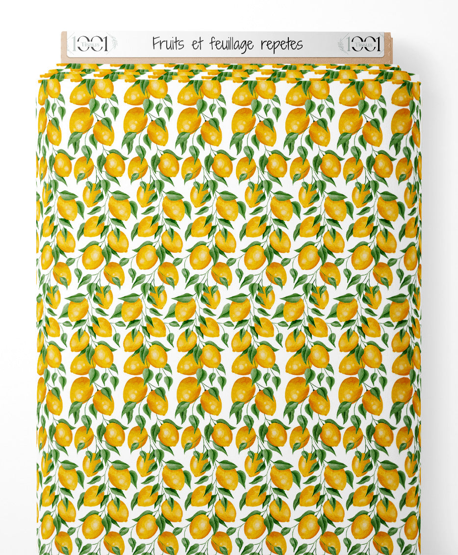 Les citrons sont d'un jaune vif et entourés de feuilles vertes. Le fond blanc met en valeur les couleurs éclatantes des citrons et des feuilles. Le motif est dense et régulier, créant une impression de fraîcheur et de vitalité.Les tissus