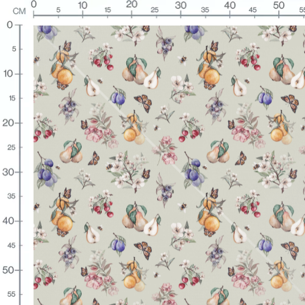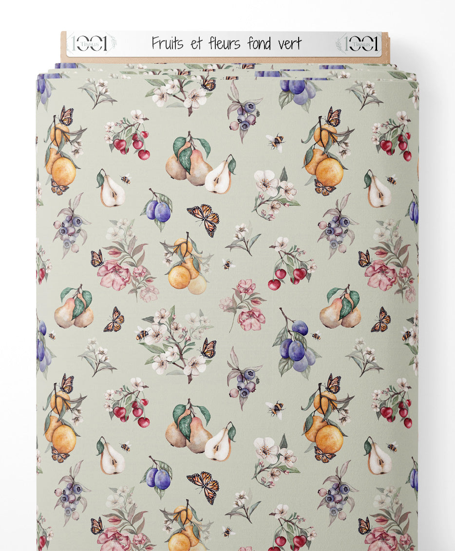 Les fruits incluent des poires, des cerises, des prunes et des baies. Les fleurs sont délicates et de différentes couleurs. Les papillons sont orange et noirs, tandis que les abeilles sont petites et détaillées.Les tissus