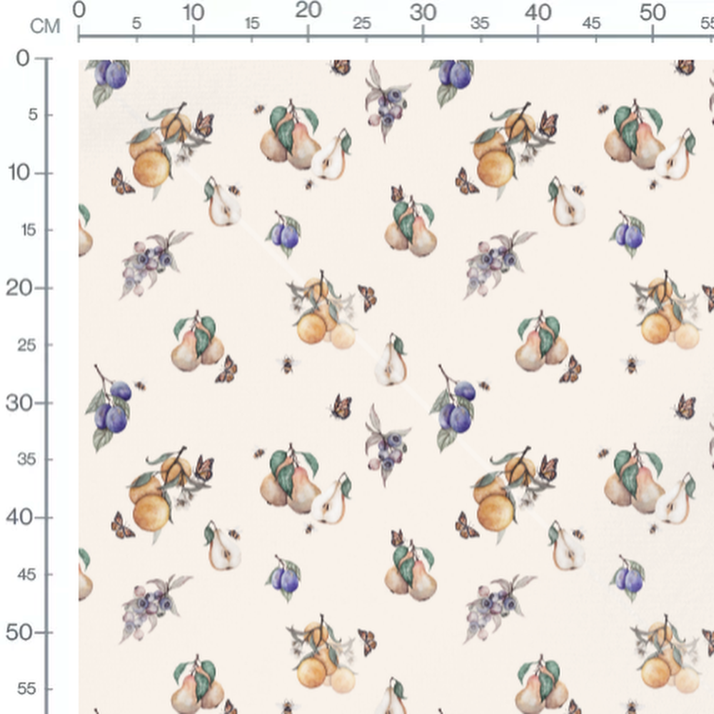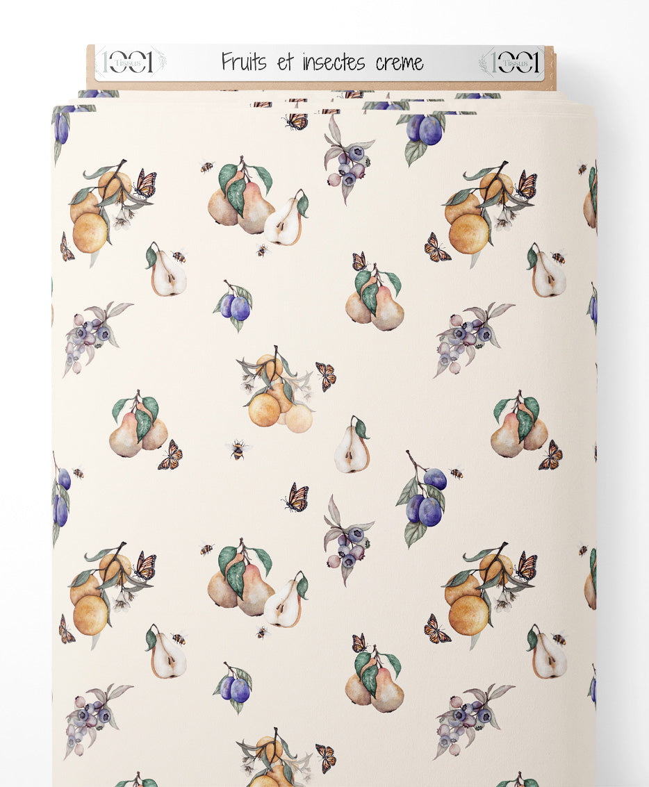 Les poires sont accompagnées de feuilles vertes. Les prunes sont d'un violet profond. Les myrtilles sont regroupées en petites grappes. Les papillons et abeilles ajoutent une touche de vie au motif.Les tissus
