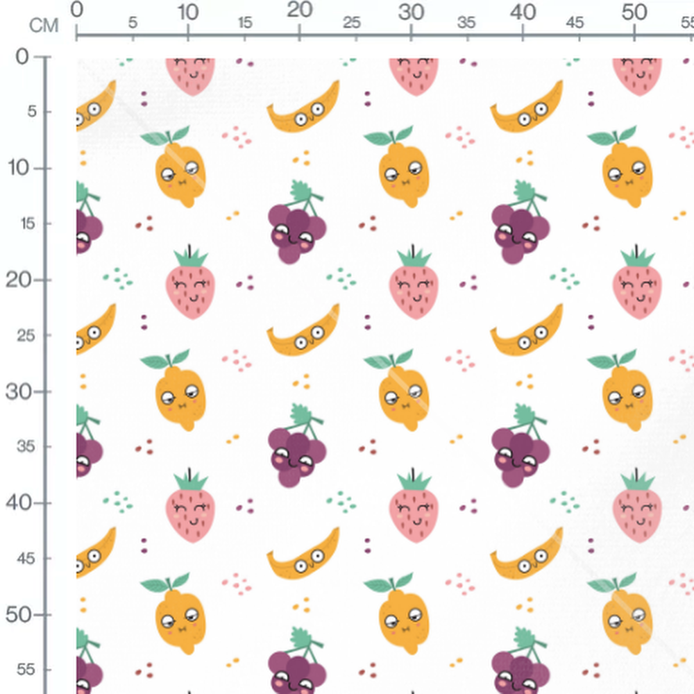 Les fruits sont dessinés avec des expressions faciales amusantes. Les fraises ont des feuilles vertes, et les raisins sont accompagnés de petites feuilles. Des petits points colorés entourent les fruits.Les tissus