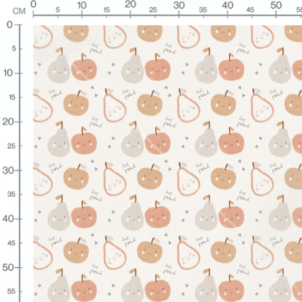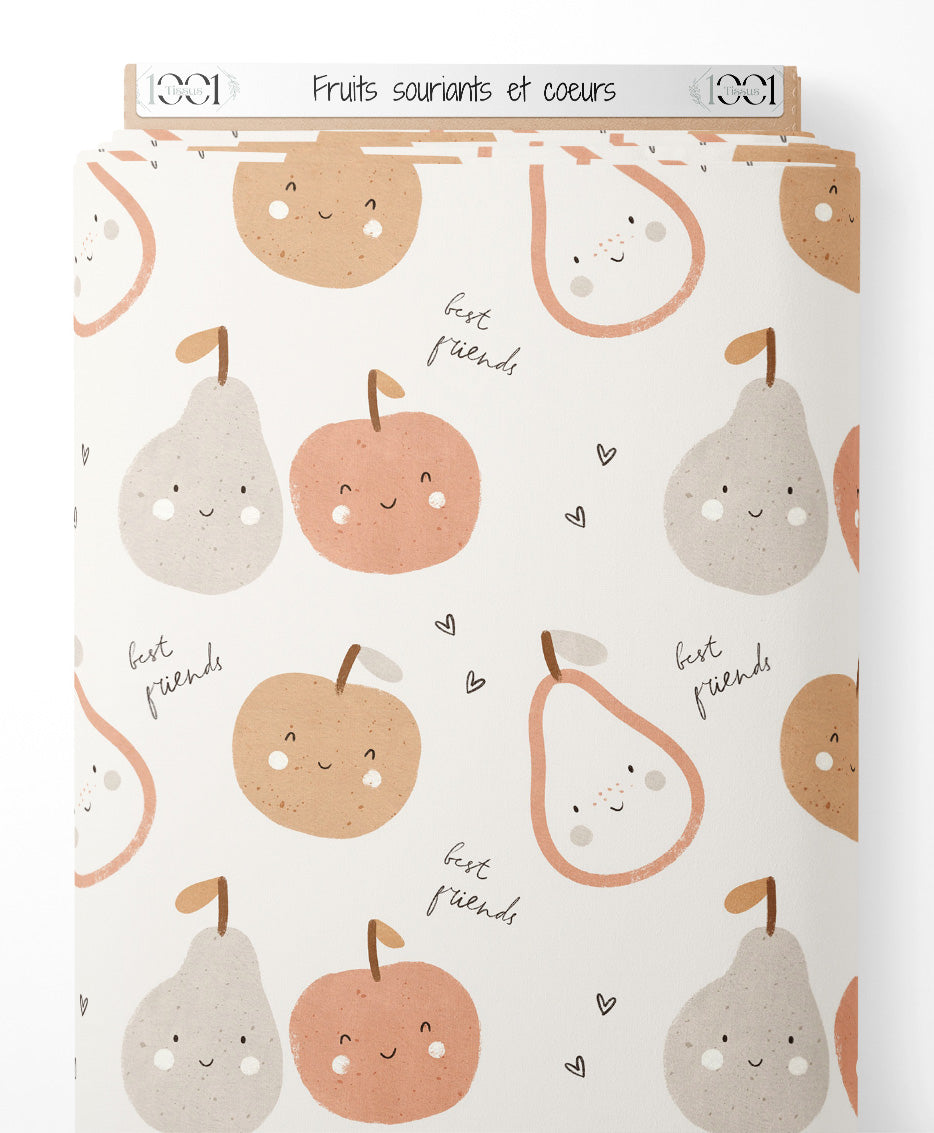 Les fruits ont des visages souriants et des joues roses. Le texte 'best friends' est écrit en lettres cursives.Les tissus