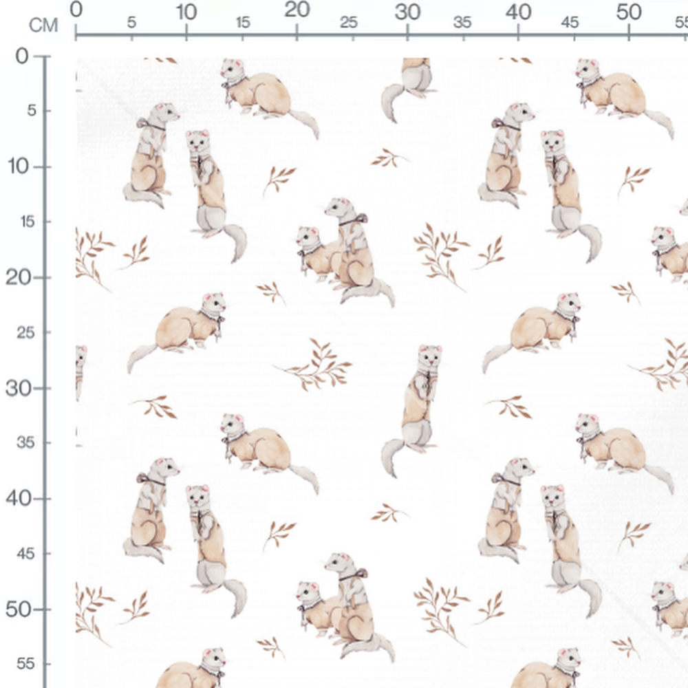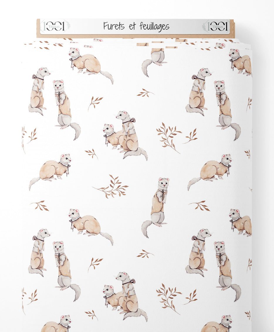Les furets portent des foulards noirs et sont dessinés dans un style aquarelle. Les feuillages ajoutent une touche naturelle et délicate au motif.Les tissus