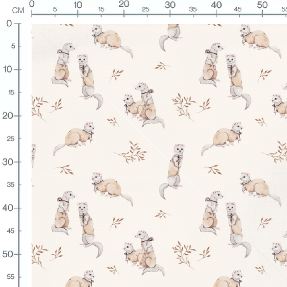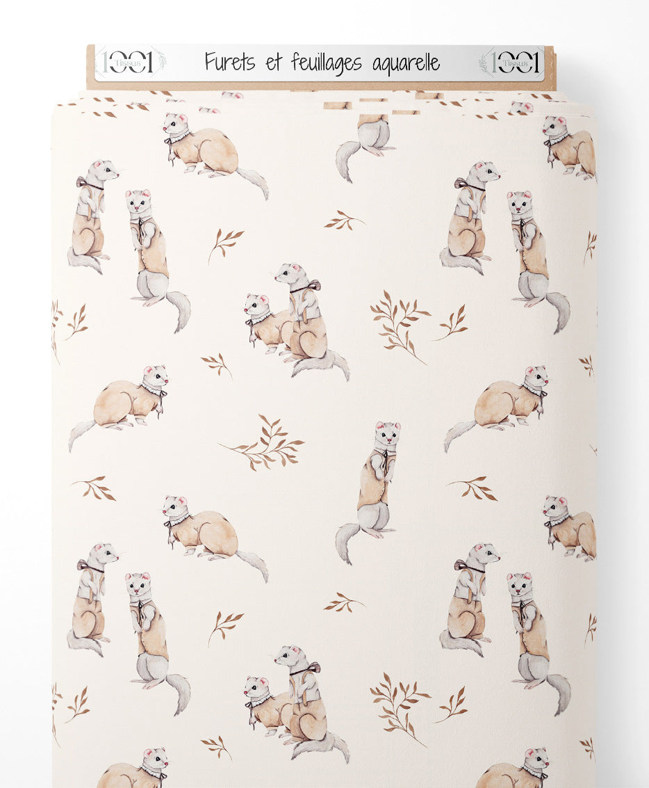 Les furets portent de petits nœuds autour du cou. Les feuillages sont délicatement dessinés en marron clair.Les tissus