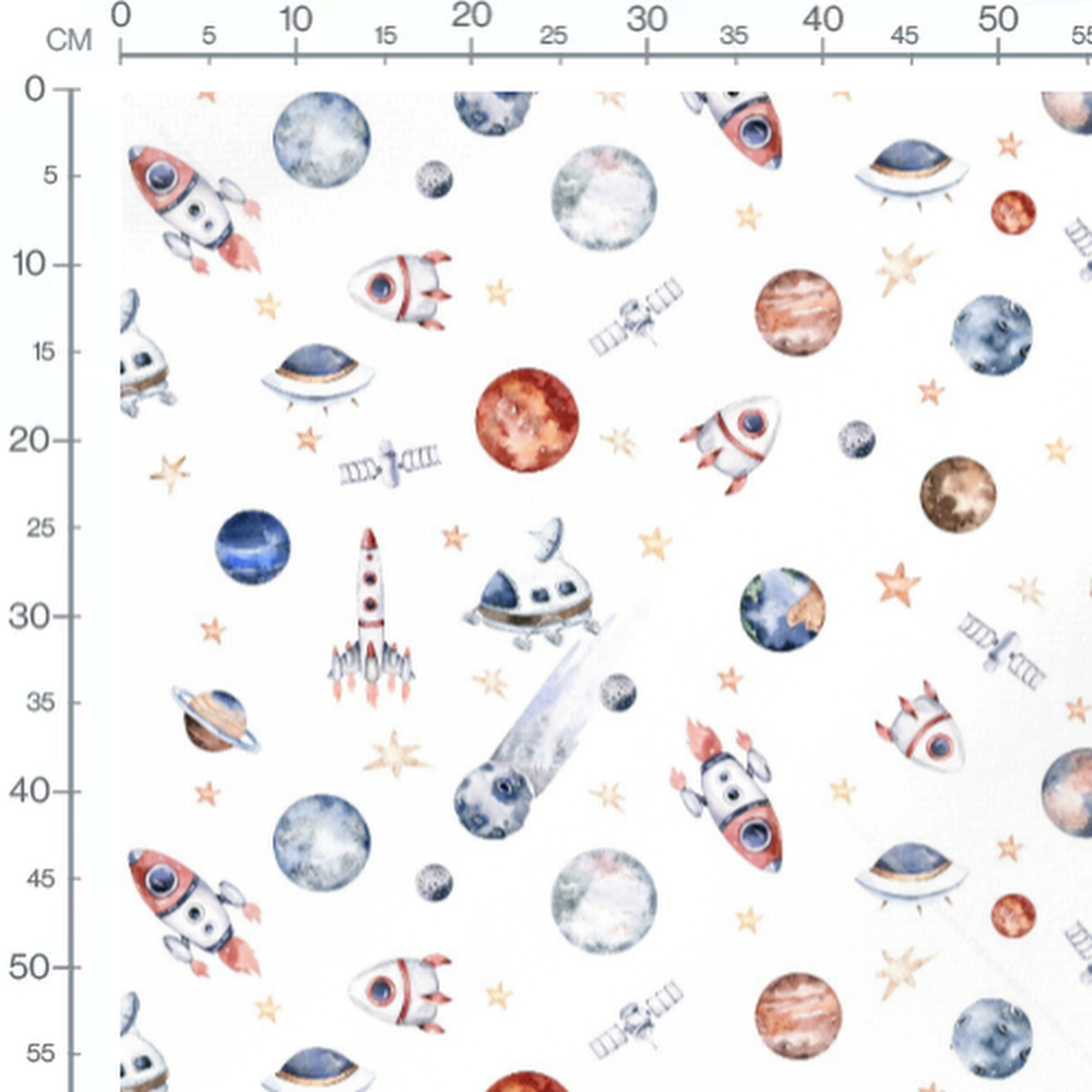 Les fusées sont principalement rouges et blanches. Les planètes varient en couleur, incluant des teintes de bleu, rouge et marron. Des satellites gris et des étoiles orange complètent le motif spatial.Les tissus