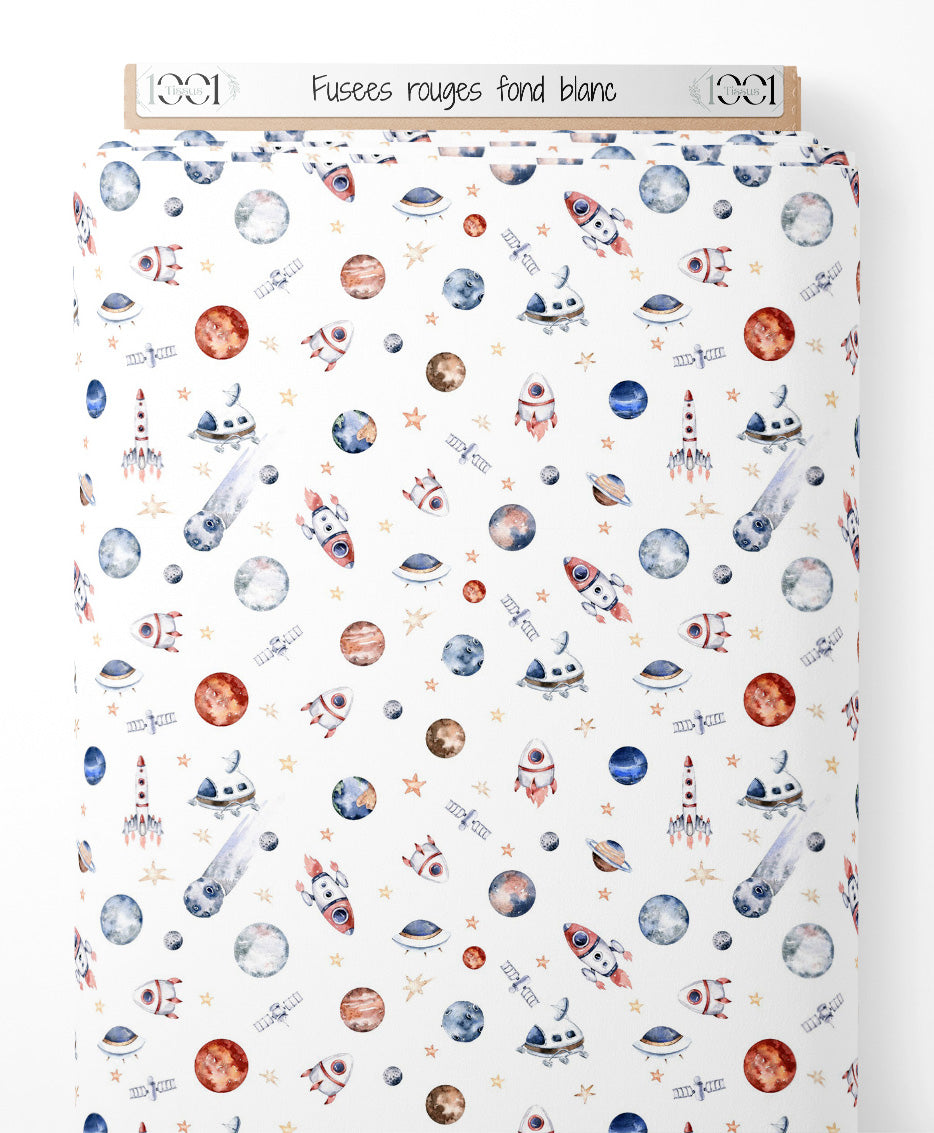 Tissu - Fusées rouges sur fond blanc