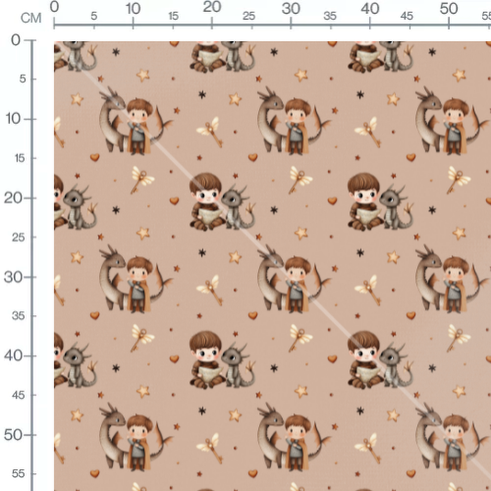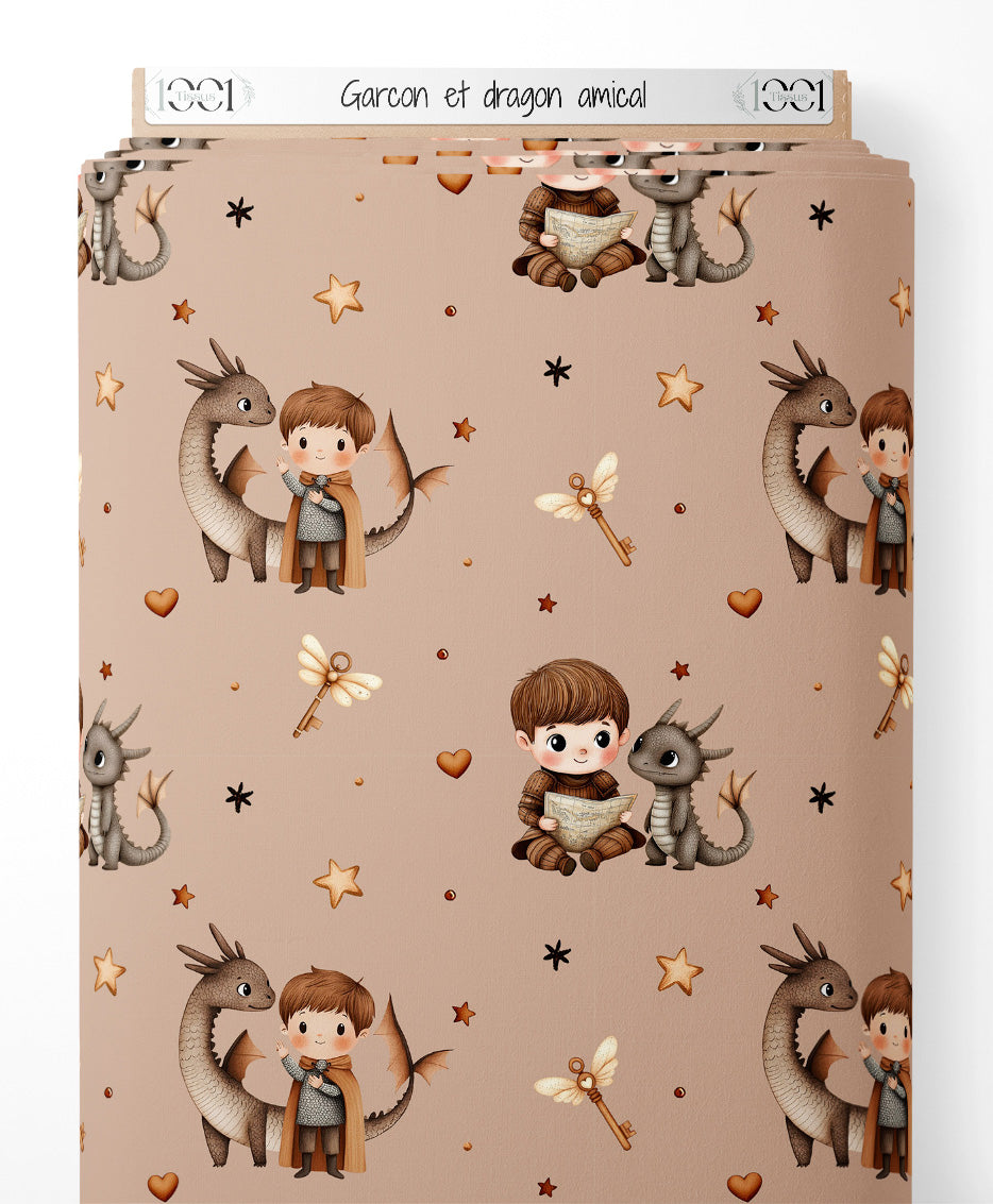 Le garçon porte une cape et se tient près du dragon. Des étoiles et des cœurs ajoutent une touche magique au motif.Les tissus