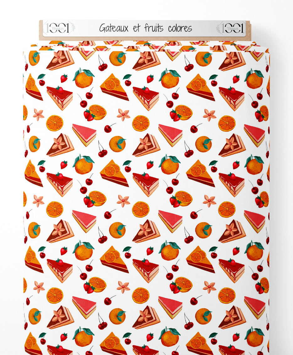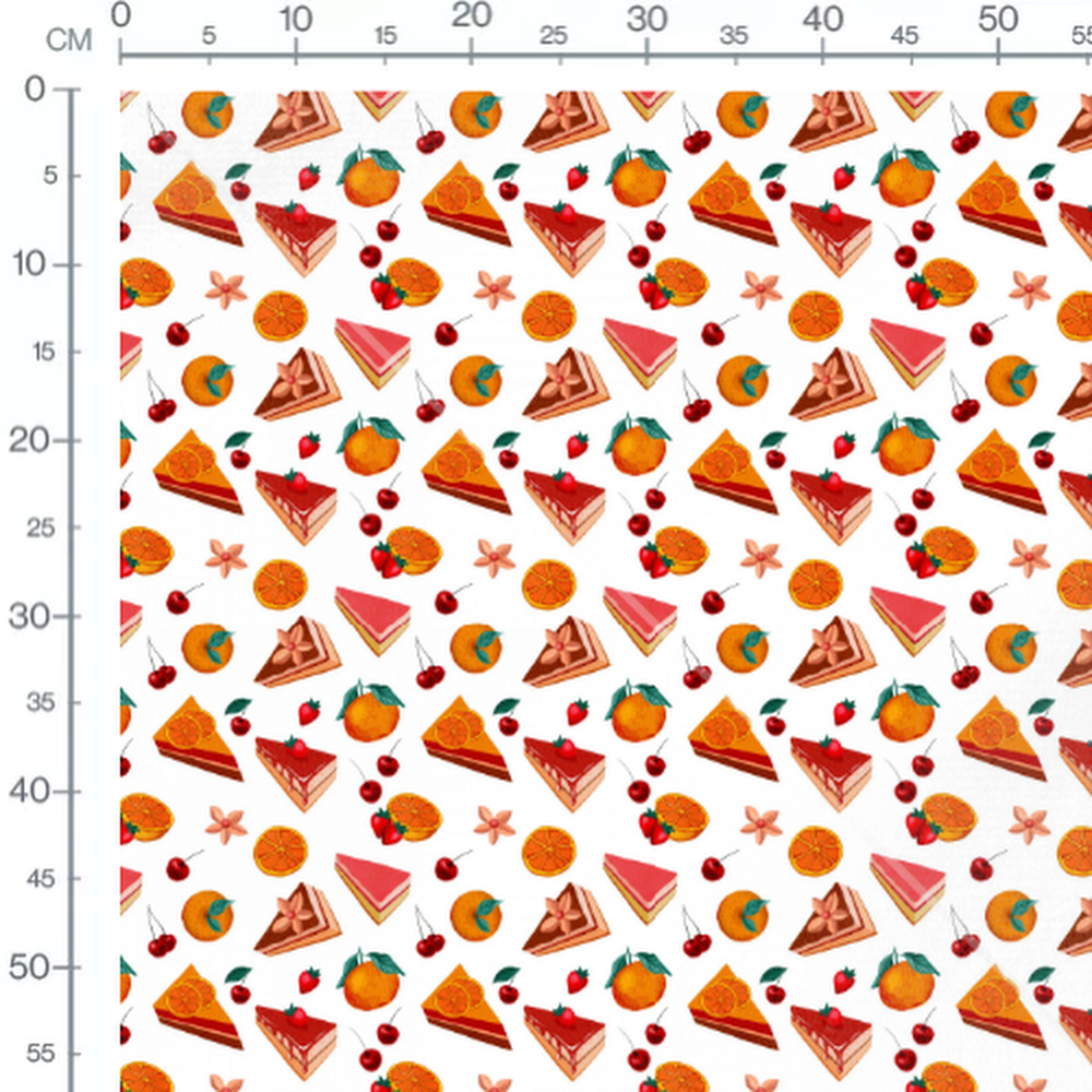 Les gâteaux sont décorés de glaçage rouge et marron avec des couches visibles. Les oranges sont entières et en tranches, accompagnées de cerises rouges vives. Des fleurs roses ajoutent une touche délicate au motif.Les tissus