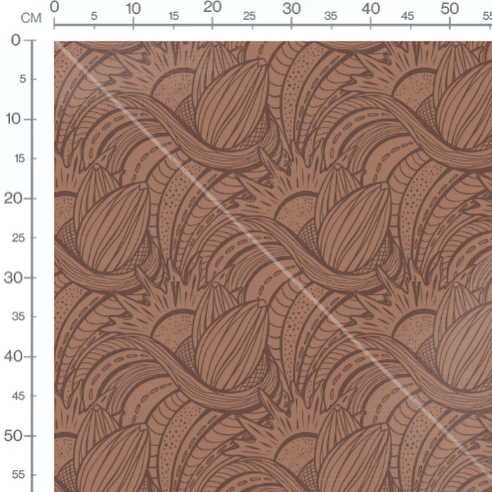 Les formes incluent des courbes et des lignes sinueuses. Des motifs géométriques ajoutent de la complexité au design. Le tout est dans des tons de brun homogènes.Les tissus