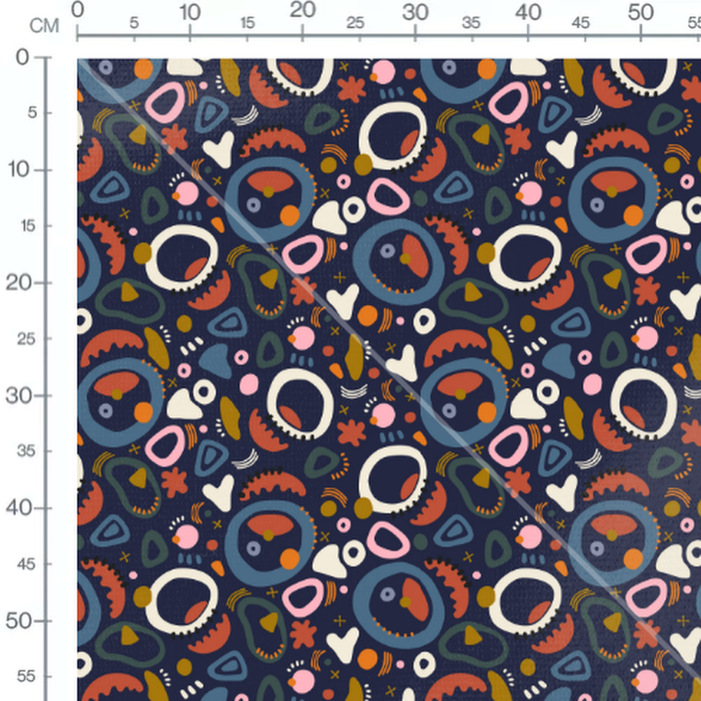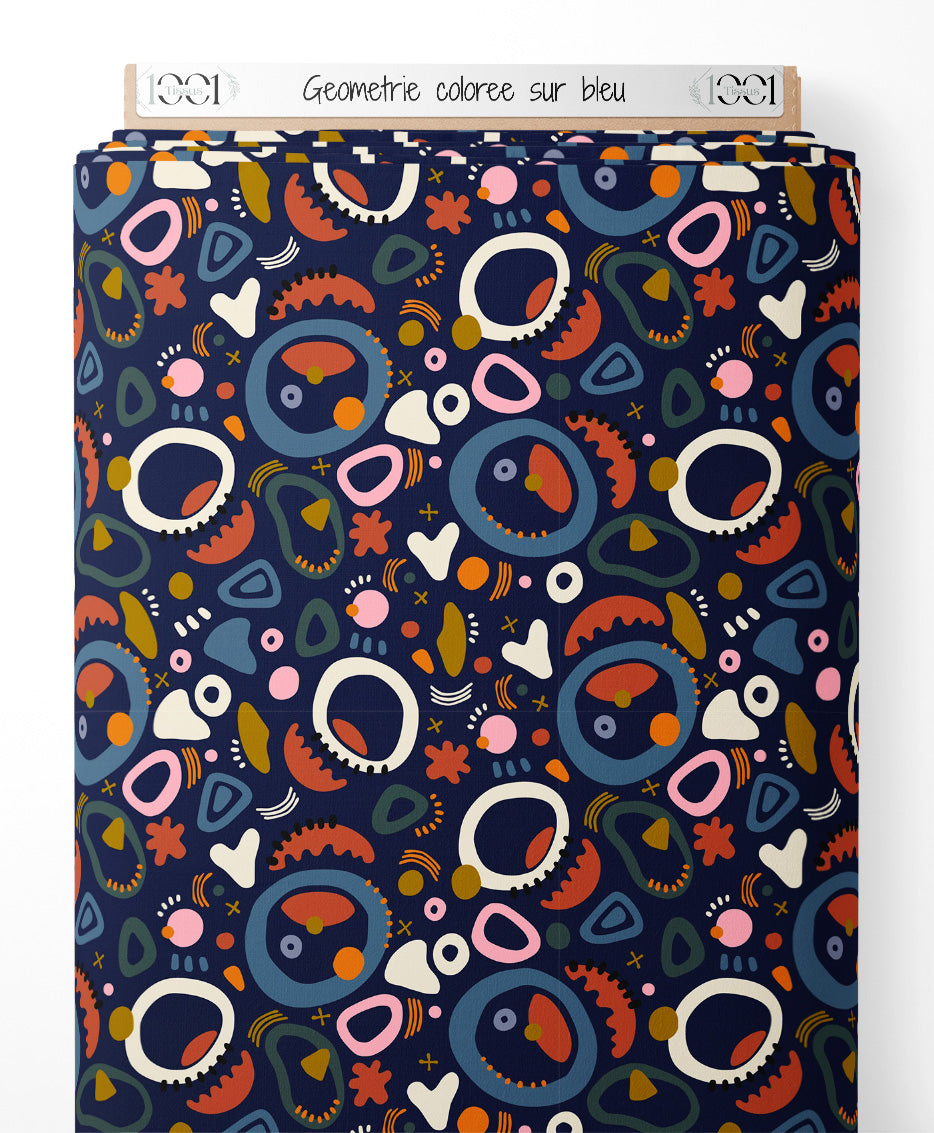 Les formes incluent des cercles, des arcs et des lignes de différentes tailles. Les couleurs principales sont le rouge, le rose, le blanc et l'orange, contrastant avec le fond bleu foncé. Des motifs de croix et de points ajoutent de la diversité au design.Les tissus