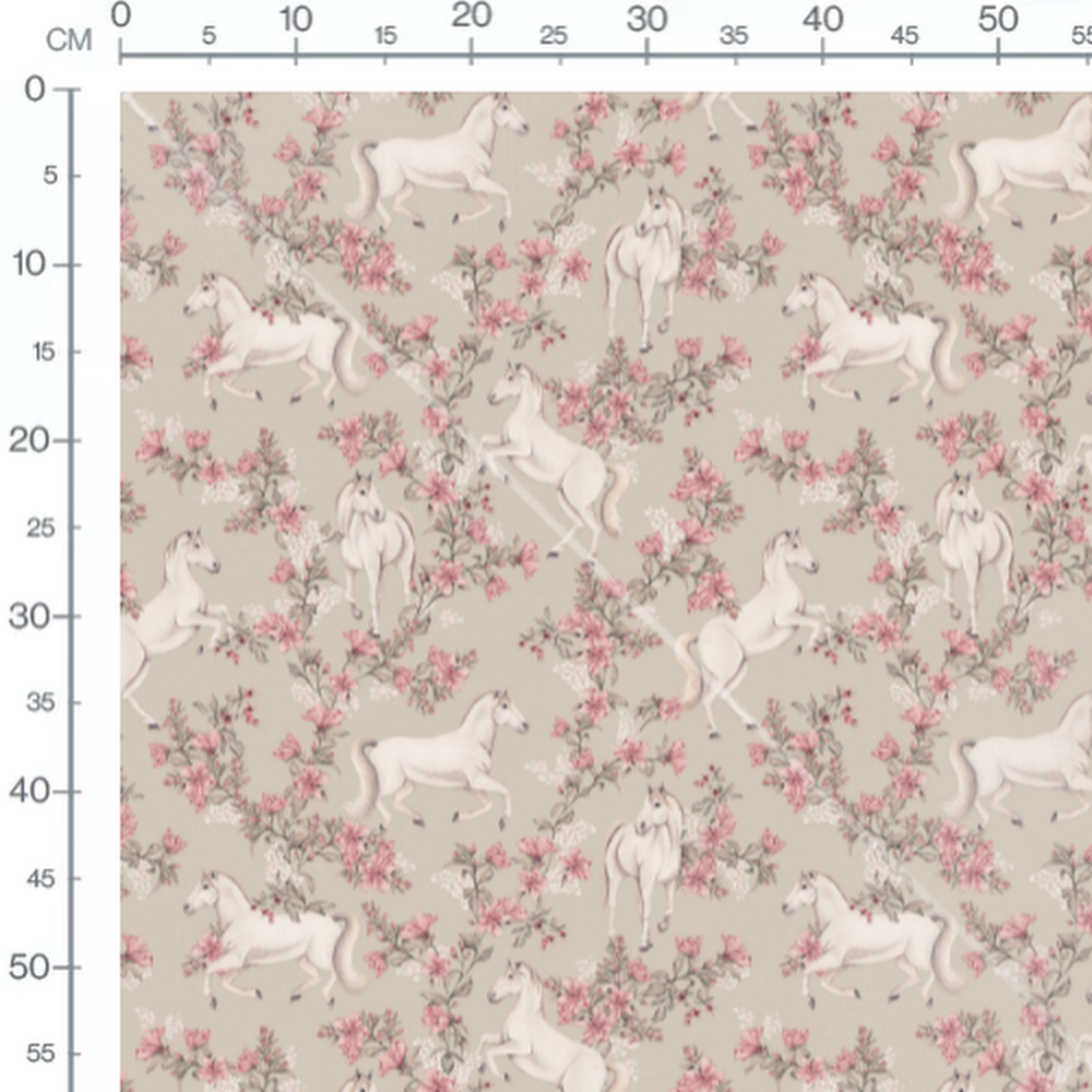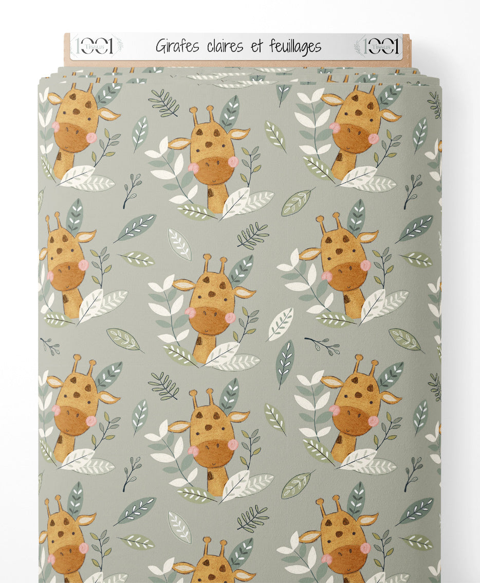 Les girafes ont des joues roses et des oreilles beige. Les feuilles sont de différentes formes et nuances de vert et blanc.Les tissus