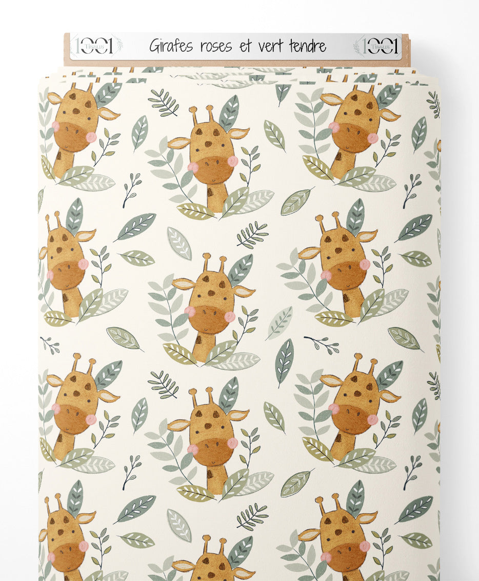 Les girafes ont des taches foncées et des oreilles claires. Les feuillages incluent des feuilles ovales et allongées. Les nuances de vert varient du vert clair au vert foncé.Les tissus