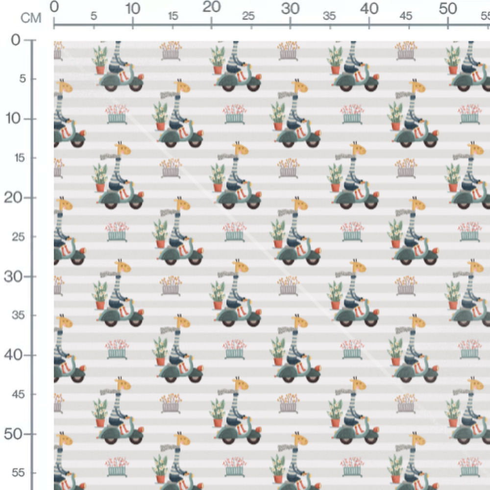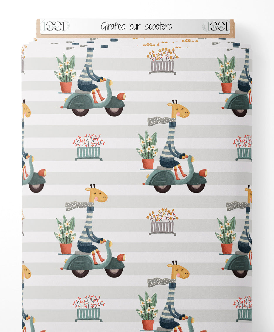Les girafes portent des pulls rayés bleus et blancs. Les scooters sont accompagnés de pots de fleurs rouges et de plantes vertes. Le fond est composé de larges rayures grises et blanches. Des motifs de fleurs en pot ajoutent une touche de couleur.Les tissus