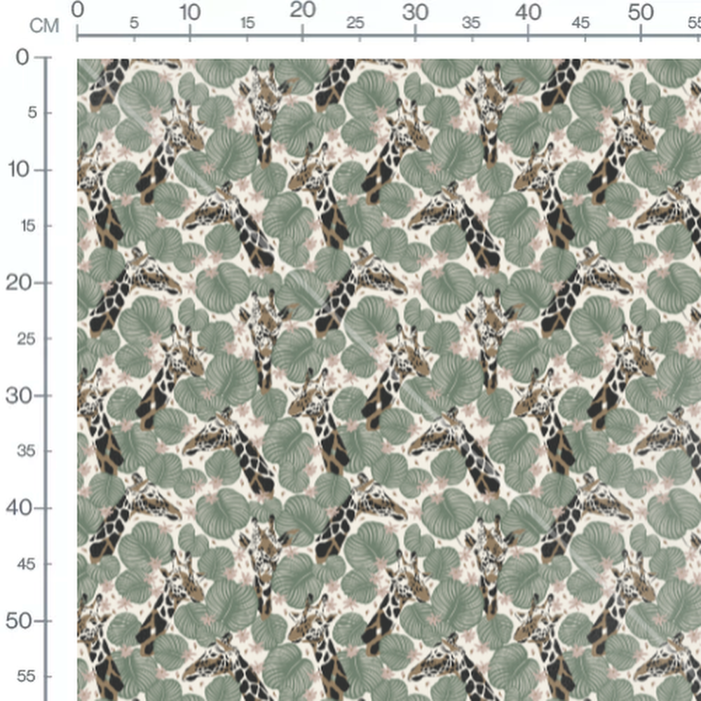 Les girafes sont entourées de grandes feuilles vertes aux motifs détaillés. Les fleurs roses ajoutent une touche de couleur subtile au motif.Les tissus