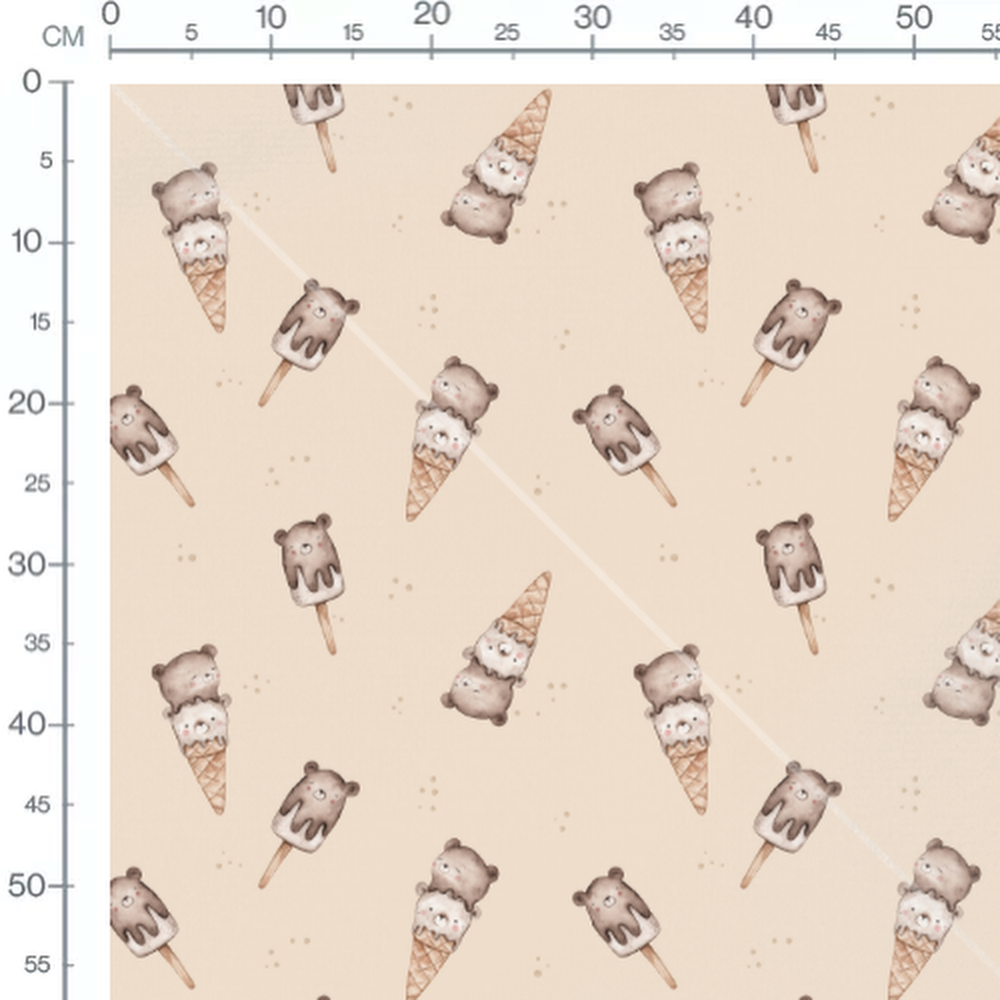 Les oursons sont représentés sous forme de glaces avec des cornets et des bâtonnets. Les couleurs marron et crème dominent le motif. Le fond beige met en valeur les détails des oursons et des glaces.Les tissus