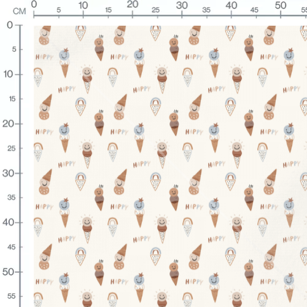Les glaces présentent des visages souriants avec des détails comme des étoiles et des couronnes. Les couleurs incluent du beige, du brun et du bleu pastel. Les mots 'HAPPY' ajoutent une touche ludique au motif.Les tissus
