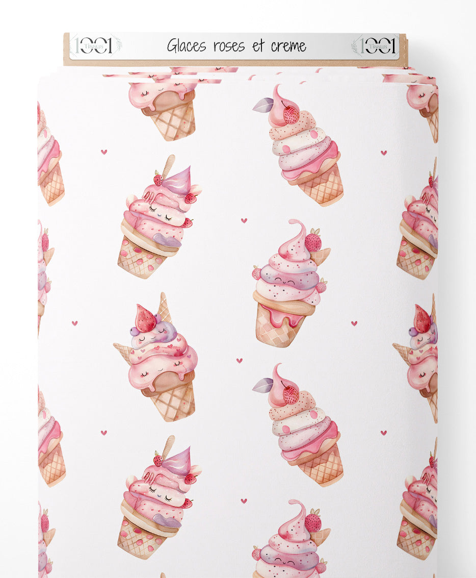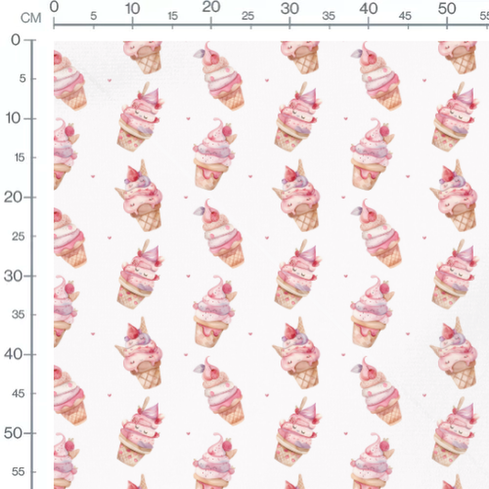 Les glaces sont ornées de fraises et de cornets gaufrés. Les visages des glaces sont expressifs et joyeux. Les cœurs ajoutent une touche de douceur au motif.Les tissus
