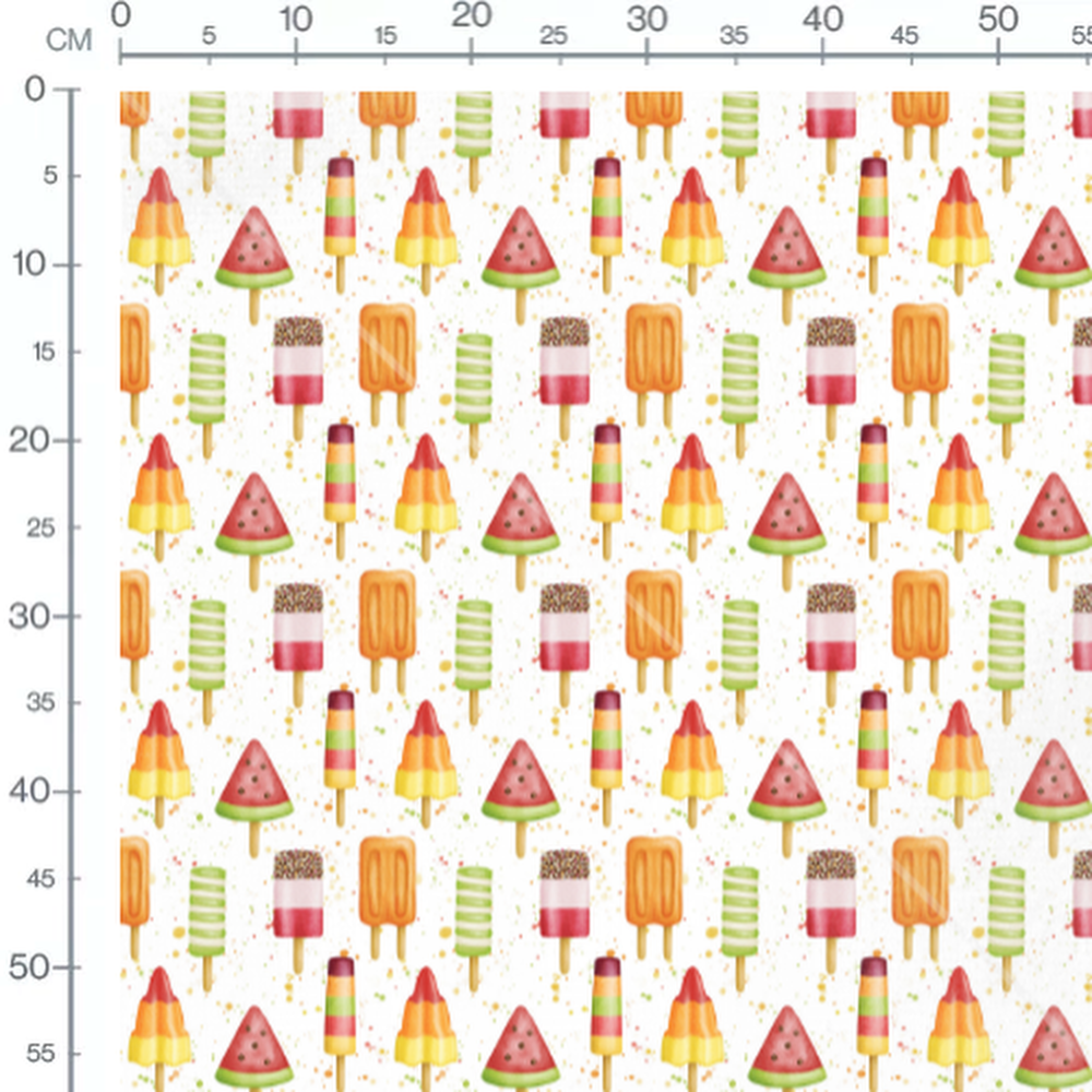 Les glaces incluent des formes de pastèque et de bâtonnets rayés. Les couleurs vives incluent du rouge, vert, orange et jaune.Les tissus