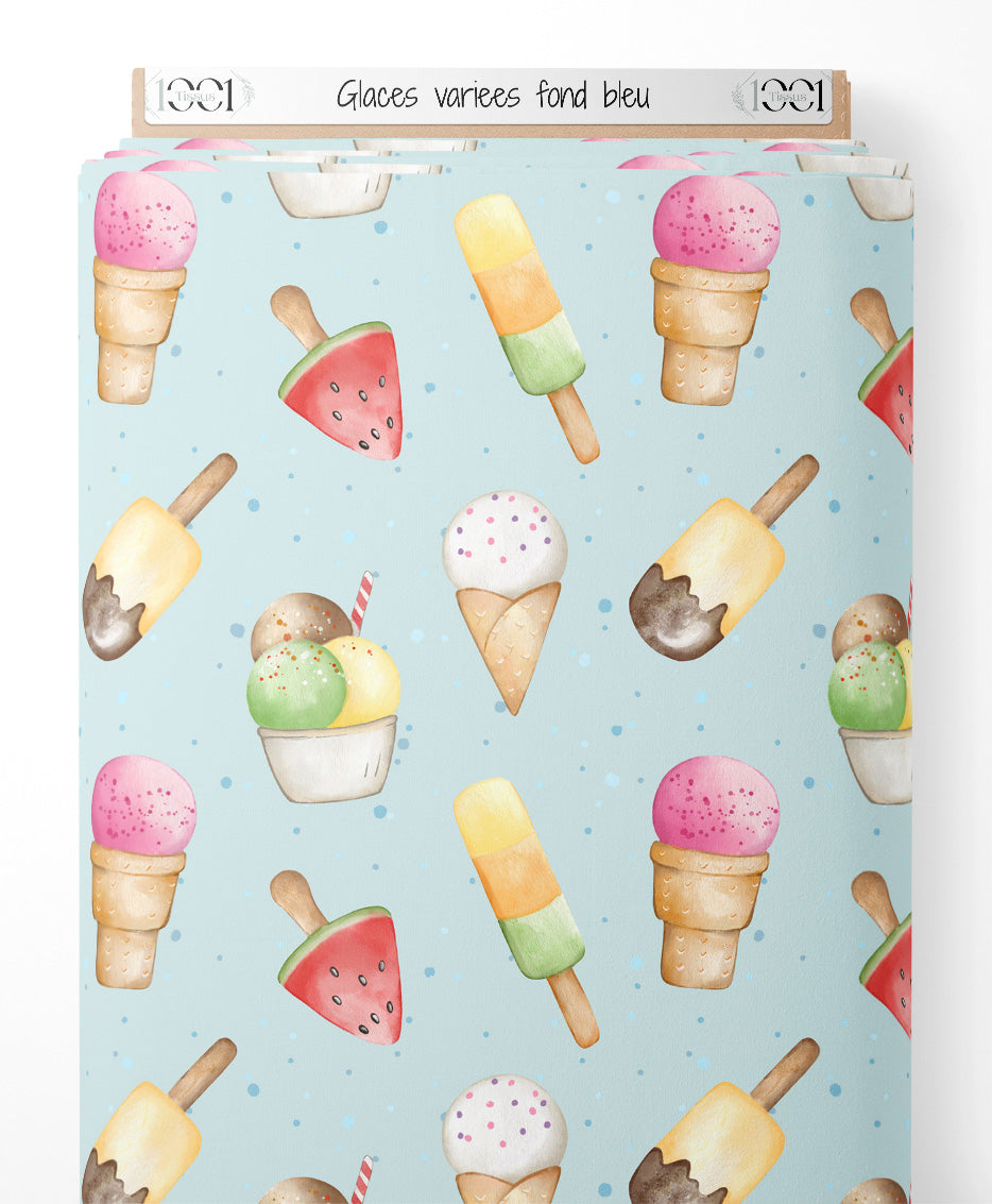 Les glaces sont de différentes formes et couleurs, incluant des cornets et des esquimaux. Des motifs de pastèques et de boules de glace sont également présents. Le fond bleu est parsemé de petits points bleus plus foncés.Les tissus