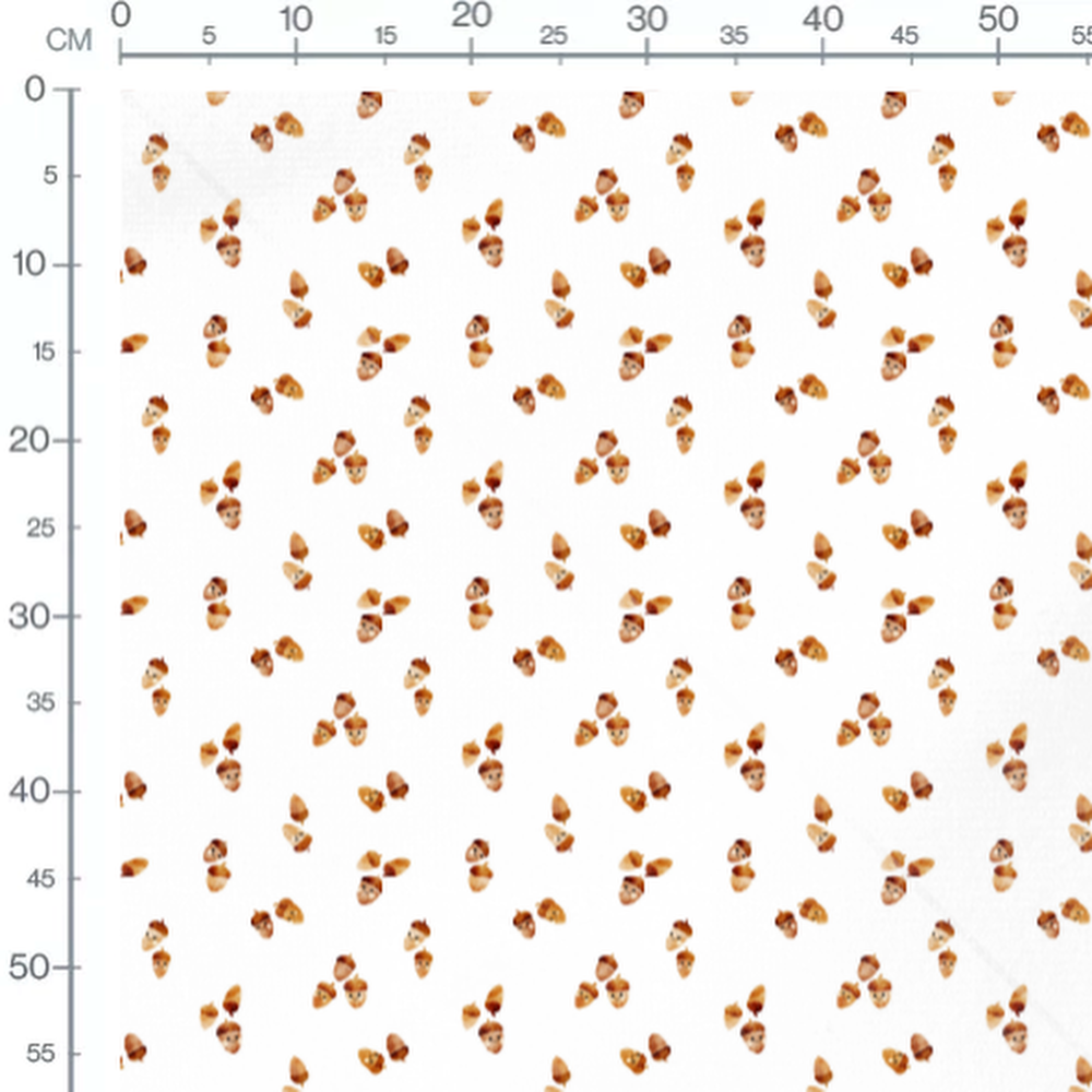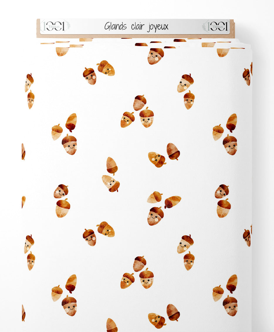 Les glands présentent des expressions joyeuses et amicales. Chaque gland est dessiné avec des détails simples et des couleurs douces. Le fond blanc met en valeur les motifs de glands.Les tissus