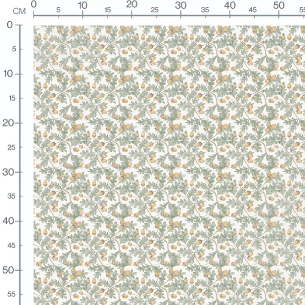 Les glands sont dessinés avec des nuances de marron et les feuilles sont d'un vert doux. Les branches brunes ajoutent une touche organique au motif. Le fond blanc met en valeur les éléments naturels.Les tissus