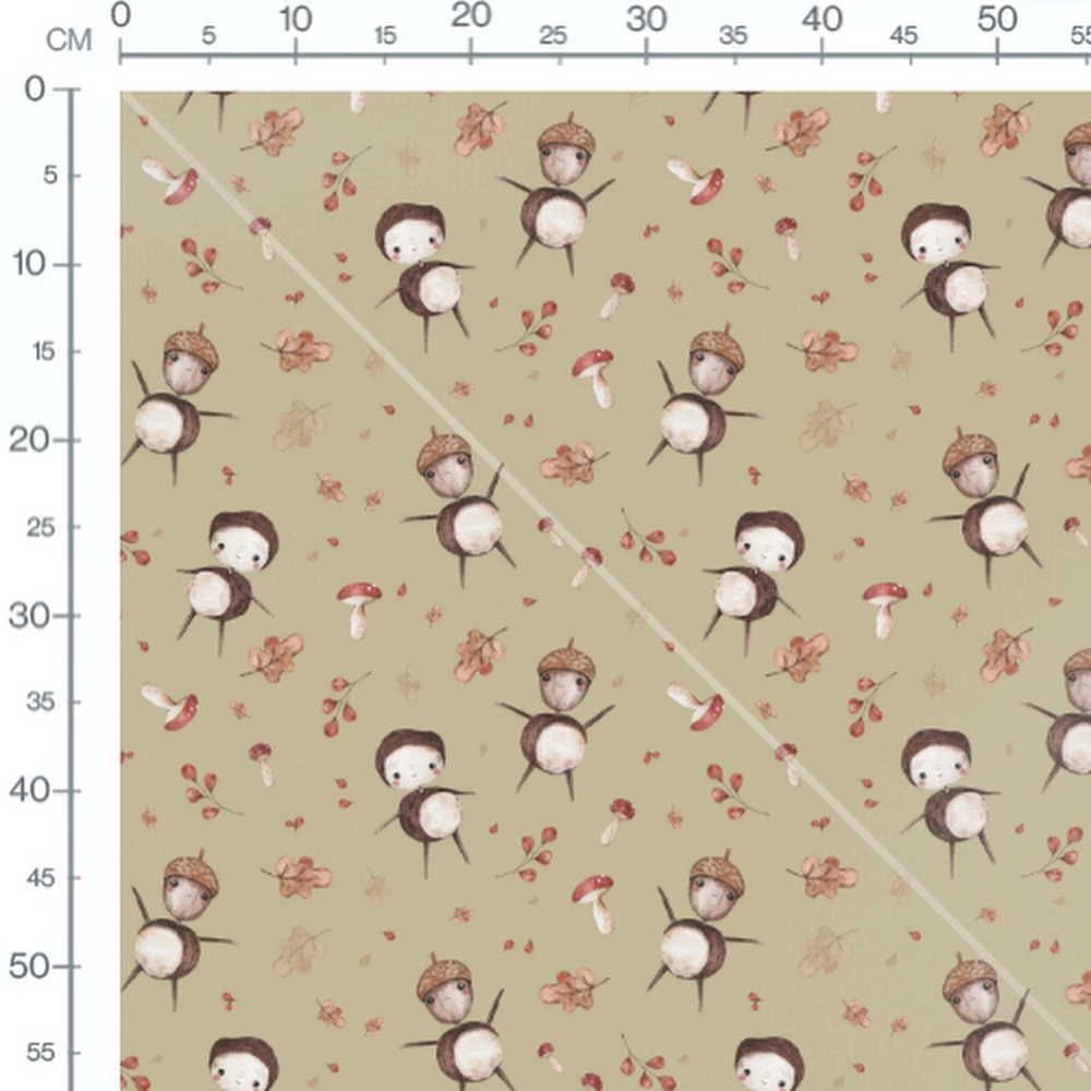 Les personnages ont des corps ronds et des têtes en forme de glands. Les champignons sont rouges avec des tiges blanches. Les feuilles d'automne sont de couleur orange et marron.Les tissus