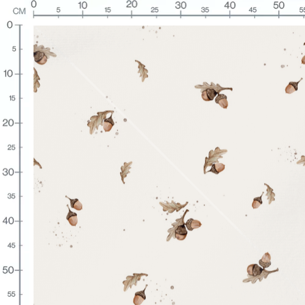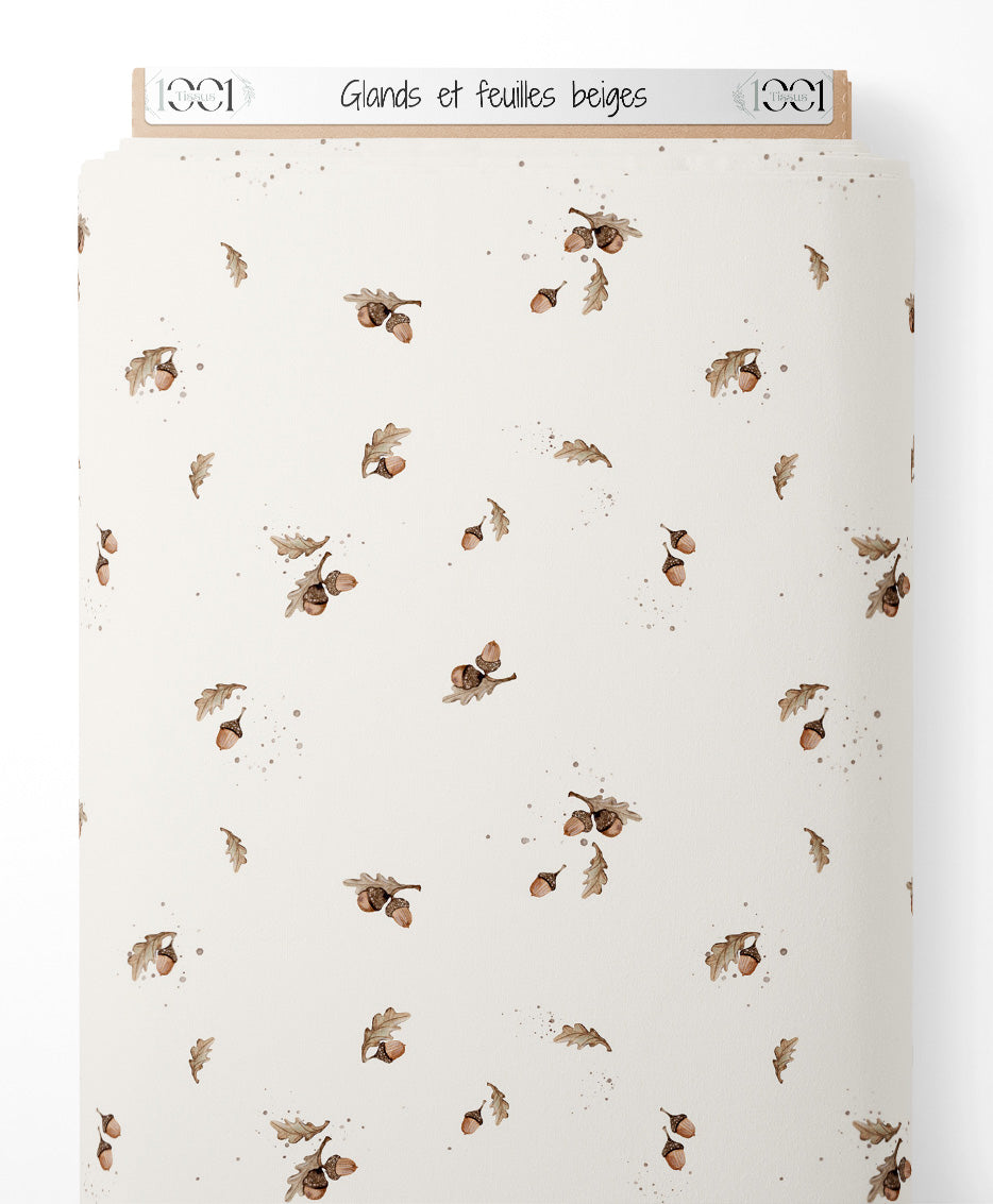 Les glands sont accompagnés de feuilles de chêne aux teintes beiges. De petites éclaboussures grises ajoutent une touche de texture au fond blanc cassé.Les tissus
