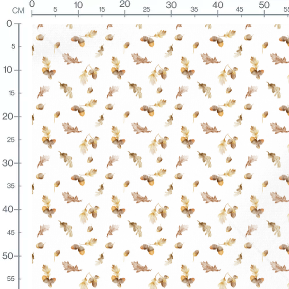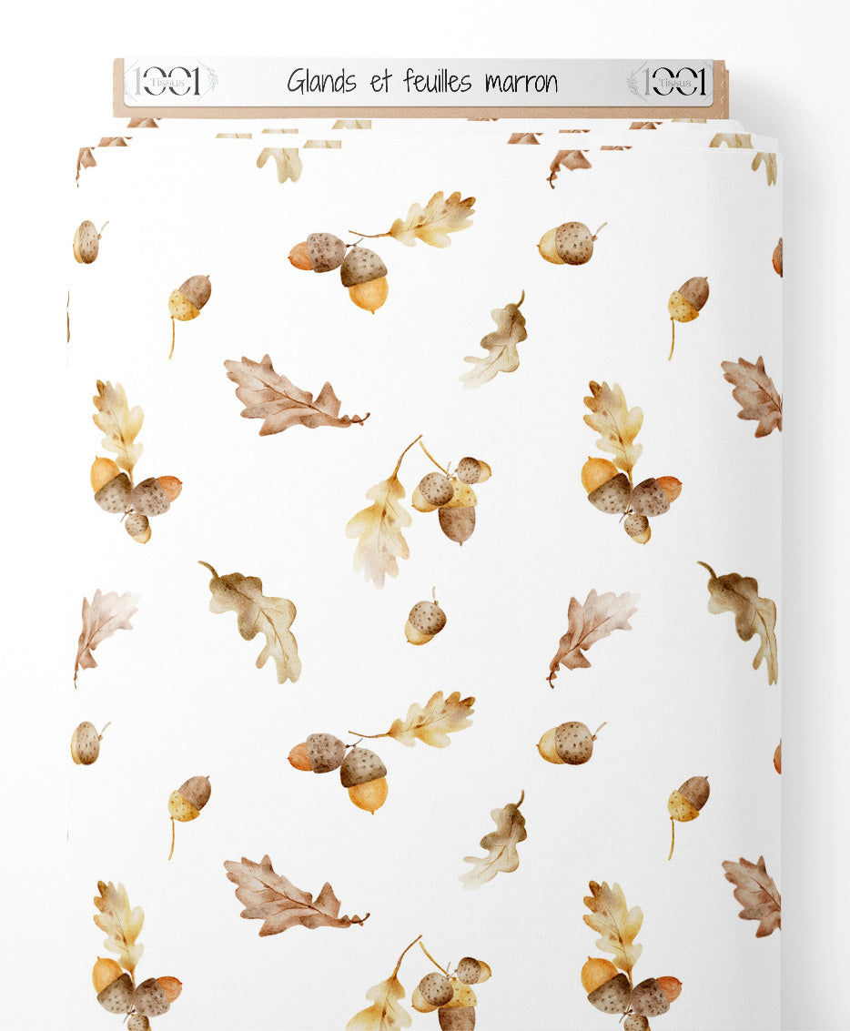 Les glands sont accompagnés de feuilles de chêne dans des tons marron et beige. Les motifs sont espacés sur un fond blanc, créant une ambiance automnale douce.Les tissus